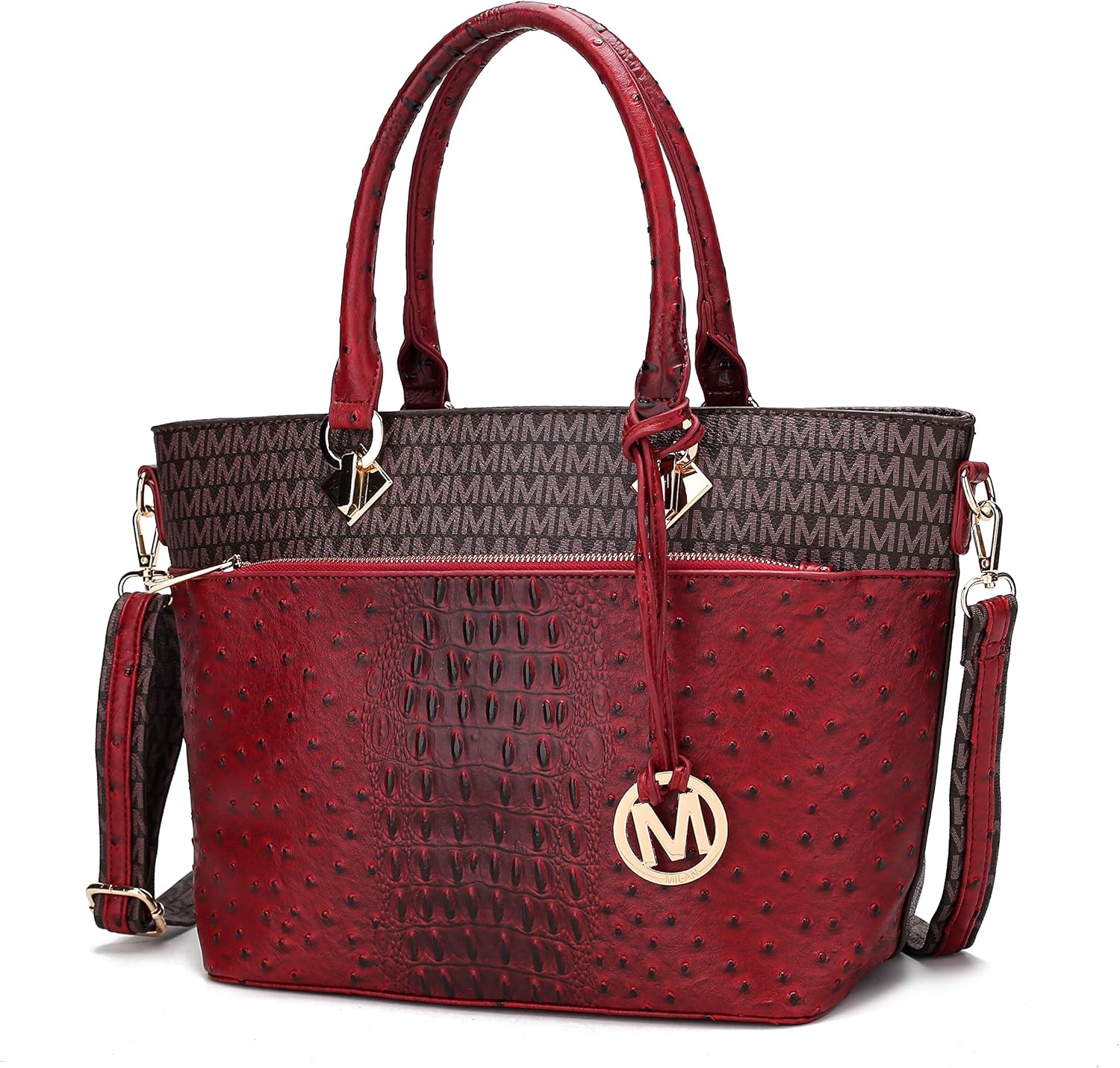 Introducing our stylish vegan leather handbag, a blend of fashion and functionality. Crafted from premium material, it boasts a top zipper closure, elegant gold-tone accents, and a faux crocodile texture. The structured design and decorative M emblem exude an air of sophistication.