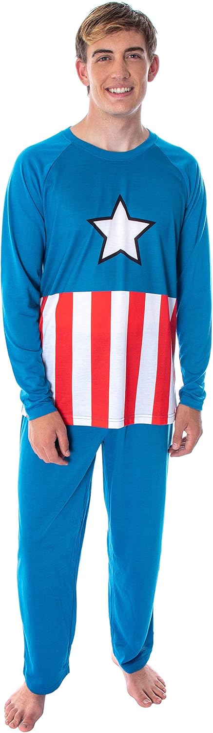 Marvel Men's Captain America Vintage Superhero Costume Raglan Top And Pants 2 Piece Pajama Set