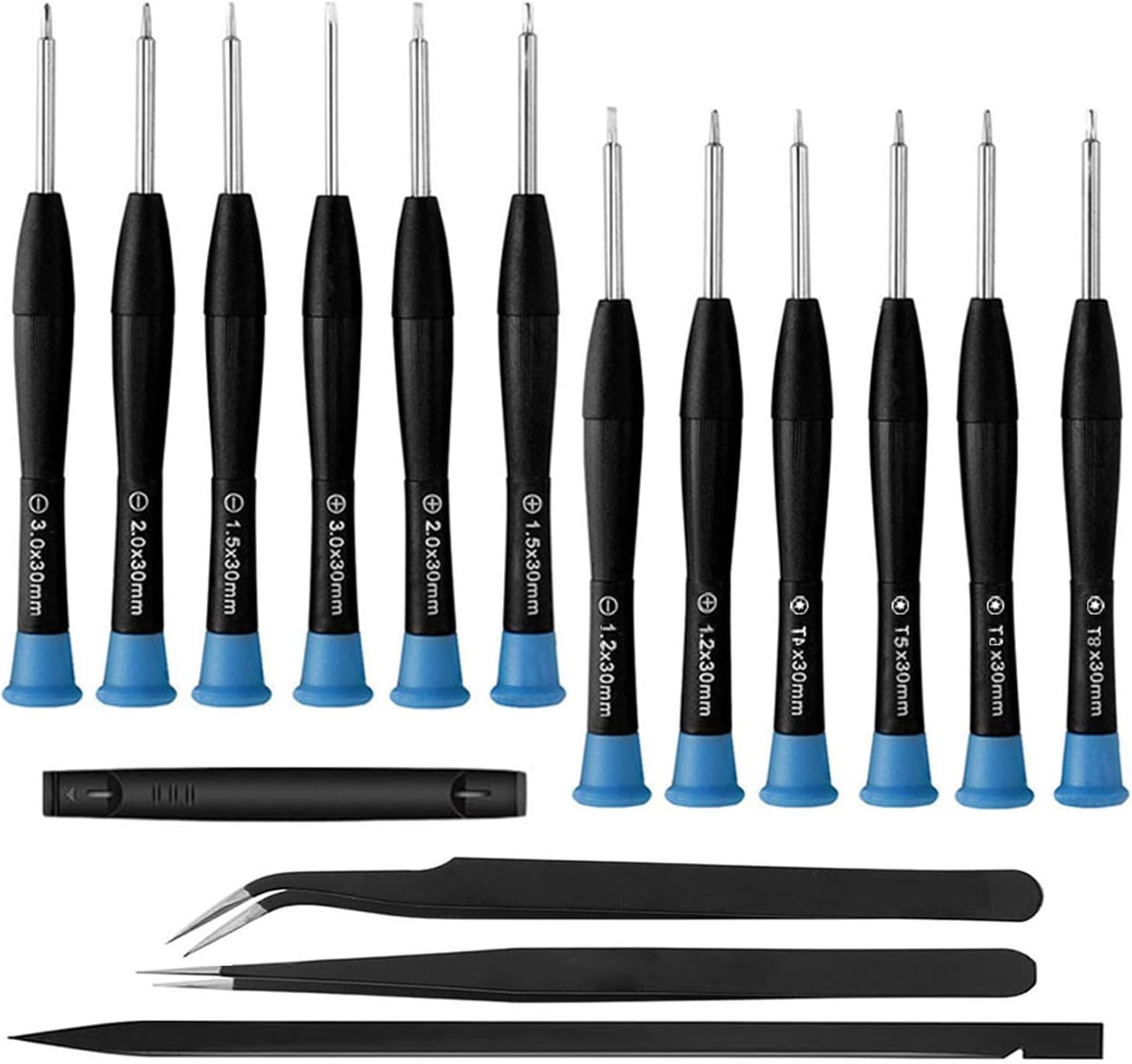 【Package Includes】Screwdriver set includes total 12 pieces screwdrivers: Flathead 1.2mm 1.5mm 2.0mm 3.0mm; Phillips 1.2mm 1.5mm, 2.0mm, 2.5mm; Torx Star T-4, T-5, T-6, T-8; 2 x Tweezers; 2 nylon spudgers; 1 Flannel bag