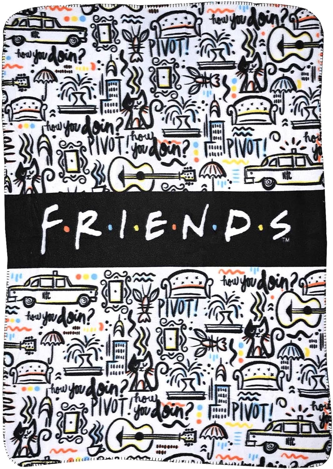 INCLUDED WITH THE PURCHASE OF FRIENDS MERCHANDISE FLEECE BLANKET PLUSH - Includes 1 Friends Fleece Throw Blanket, a soft and cozy plush throw blanket with cool printed NYC inspired designs & famous phrases from the show. A multipurpose fleece fabric throw that you can use as a backdrop wall decoration for your bedroom, sleeping mat and a warmer. Friends throw blanket measures about 45” x 60” inches, perfect size for kids, teens, and adults.