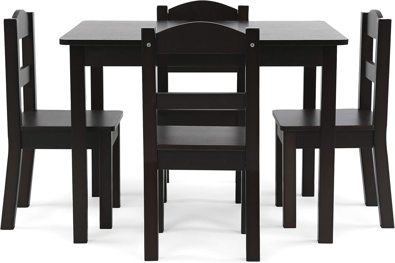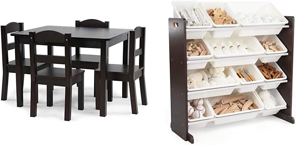 Humble Crew Kids Wood Table & 4 Chair Set​, 5-Piece, EspressoThe Humble Crew Kids Wood Table and 4 Chairs Set is the perfect size for children to eat, read books, color, do arts and crafts, play board games, and just have fun. The table and chair set is ideal for your toddler's bedroom, playroom, or the living room. This piece of furniture is easy to assemble and the sturdy table and chairs are great for boys and girls ages 3 years and up. Construction on this engineered wood table and chair set offers solid support and long-lasting durability. The height of this furniture is just right for toddlers and preschool-aged children. Giving your little one a table and chair set at their size gives them a sense of control and helps them learn independence. This kids table and chairs set comes in multiple color options to complement the existing furniture in your home as well as the toy storage organizer products in Humble Crew' line of kids furniture. Color options include Primary Collection: natural table with primary chairs (red, green, blue, yellow); Summit Collection: White table and chairs; Pastel Collection: white table with pastel chairs (pink, light green, baby blue, light yellow); Friends Collection: White table with pink and purple chairs (pink, purple, dark pink, white); Espresso Collection: espresso table and chairs. Product sizing – Table: 26”W x 22”D x 19”H Chairs: 10”W x 10”D x 22”H Seat height: 10”H Humble Crew offers a full line of children's furniture, organizational basics, and storage solutions. We have multiple room collections that fit the style of any home. Our children's table and chairs, toy storage organizers, toy boxes, bookcases, beds, and upholstered chairs blend with all of your home's furniture. Whether it's the living room, playroom, or your child's bedroom, Humble Crew has just the right product to help your family grow.Humble Crew Modern Toy Organizer with 12 Bins, Espresso/Whitep>This space-saving Tot Tutors Kids Toy Storage Organizer with 12 Plastic Bins stores lots of children's toys in easy-to-see, easy-to-access plastic bins. The 8 standard and 4 large easy access storage containers are removable, making it fun for kids to take out toys, books, and games for playtime and quick to clean up after. This toy storage box alternative helps keep your little one’s room clean while at the same time the bins can teach color identification as well as sorting and cognitive skills.