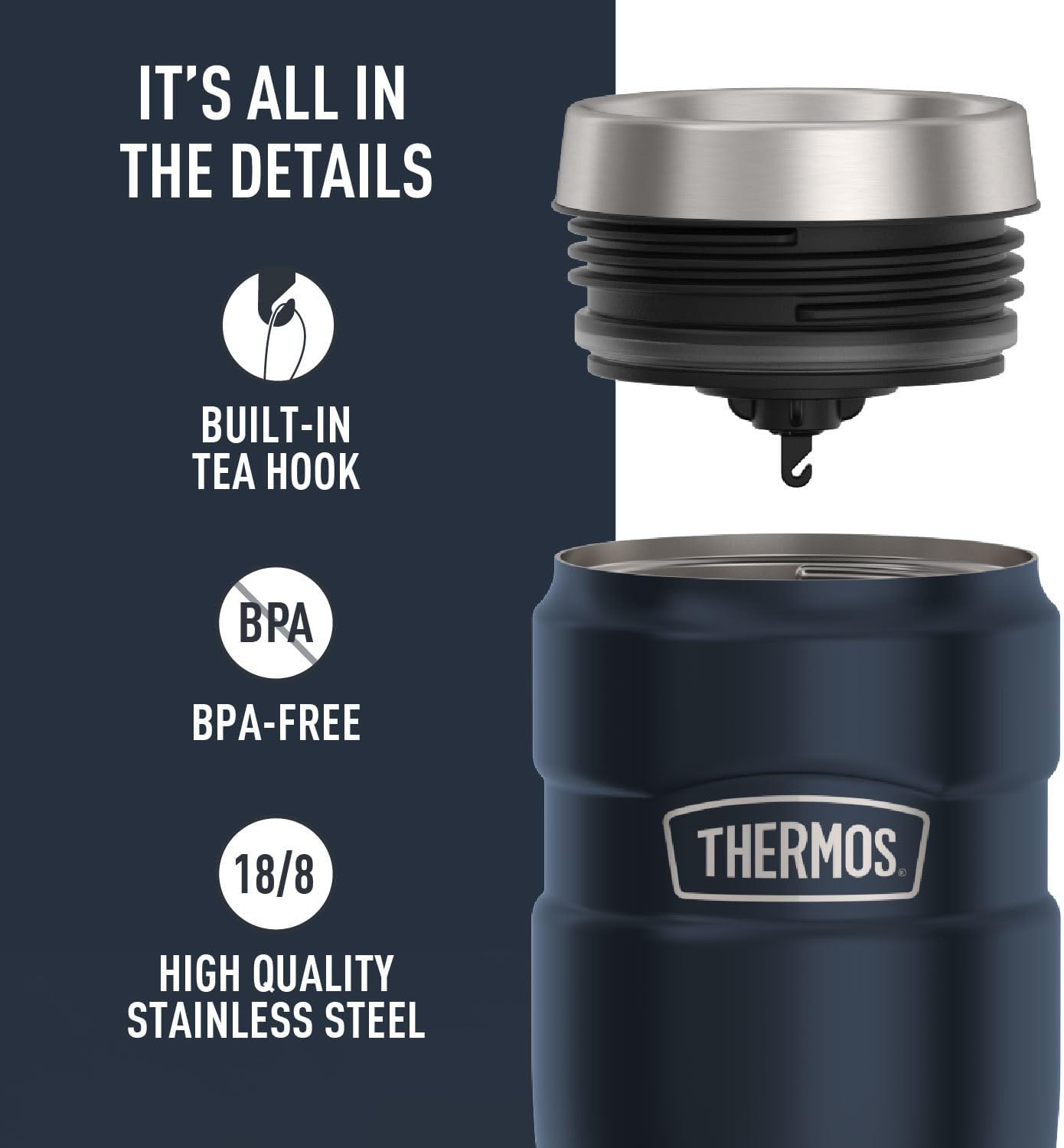 SE MANTIENE CALDO O FRÍO: Tecnología de aislamiento al vacío THERMOS para máxima retención de temperatura de bebidas calientes o frías; Mantiene tu café o té de la mañana caliente hasta por 7 horas y las bebidas heladas frías hasta por 18 horas