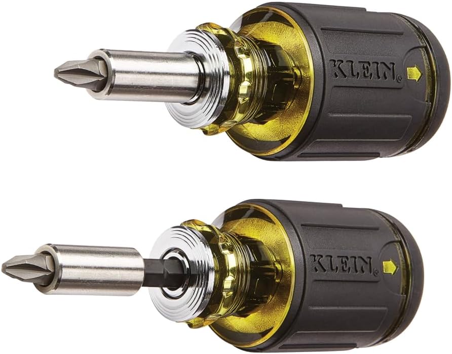 Klein Tools 32308 Multi-bit Stubby Screwdriver, Impact Rated 8-in-1 Adjustable Magnetic Tool with Phillips, Slotted, Square and Nut Driver