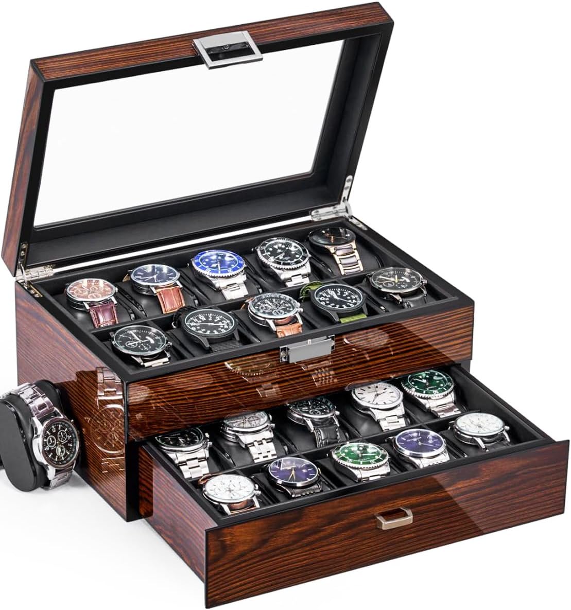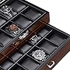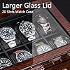 BEWISHOME Watch Box Estuche para reloj de 20 ranuras para hombres - Organizador de relojes de lujo con tapa de vidrio, interior de piel sintética lisa, marrón SSH04Y