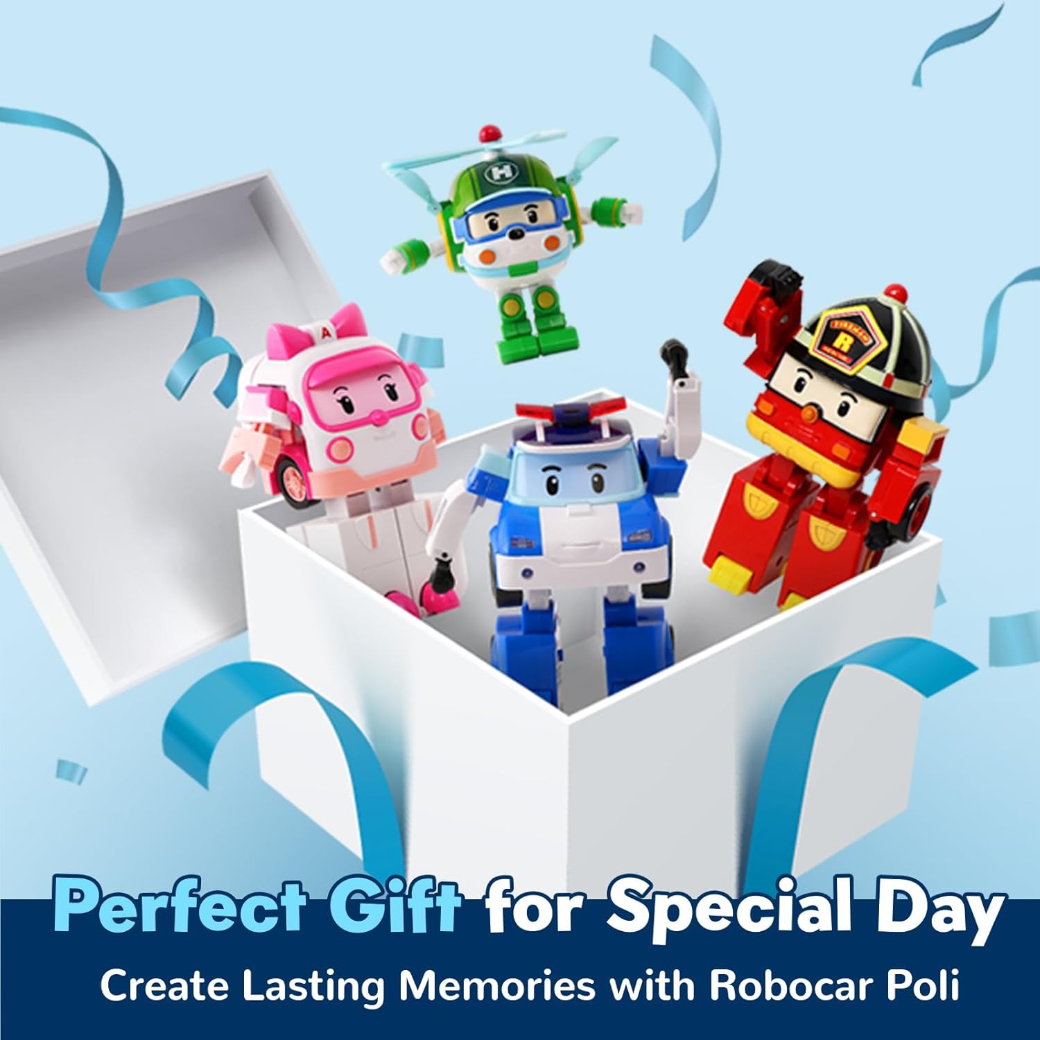 Robocar Poli 4" Transforming Robot - Paquete de 4 (Poli, Roy, Amber, Helly) – Figuras de Vehículos de Emergencia | Juego de Equipo de Rescate para Regalo de Niños y Niñas de 1–5 años