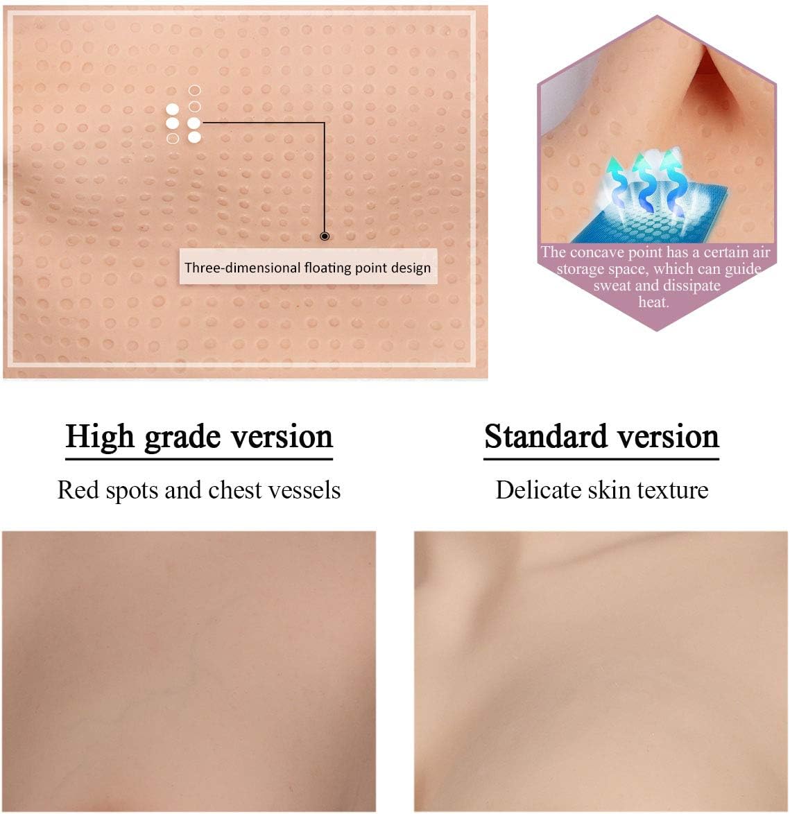 Features: 1) Internal floating point, delaying sweating, improve air circulation 2) The lower chest is an arc, which is more close to the body 3) The surface is added with a protective layer that does not stick to the hair 4) Matte surface, does not produce oil 5) Bloodshot and skin texture are more realistic, the veins are distributed under the skin 6)Added a option of simulating skin spots, the high-end configuration is more suitable for your needs. Specifications: Material: Food grade silicone Size: L size with C,D,E,H cup Suitable people: L for the bust in 34.2-51.3 inch Color: Ivory(#1), yellow(#2), bronze(#3) Filler: Silica gel/Silk cotton Error range: 2cm-4cm Note 1. This product is easy dyeing, so do not wear faded clothes or jewelry. Keep away from hot temperature, sunshine, sharp pointy things, washing machine, chemical material, don't use nails or sharp items to scratch it. 2. Clean it in lukewarm water with mild soap, air-dry or use a towel gently. 3. Please roll up the edge of the product for 5 ~ 10cm then wear it. (Because the edge is thin, so it's better to roll up the edge before you wear the breast) 4. Because the production batch, the silicone products your received perhaps have a little color difference with pictures, hope you can understand. 5. All of our items are new from factory, it's normal that some some of them may have a little smells, but it will disappear soon, please don't worry. 6. The pictures are for reference, the effect will not be the same with different body type, if you receive the goods are not satisfied, please contact us, we can help you solve the problem!