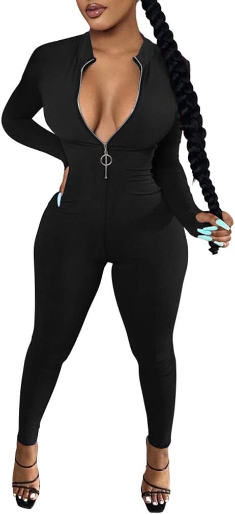 LAGSHIAN Women's Sexy Casual Long Sleeve V Neck Zipper One Piece Bodycon Jumpsuit