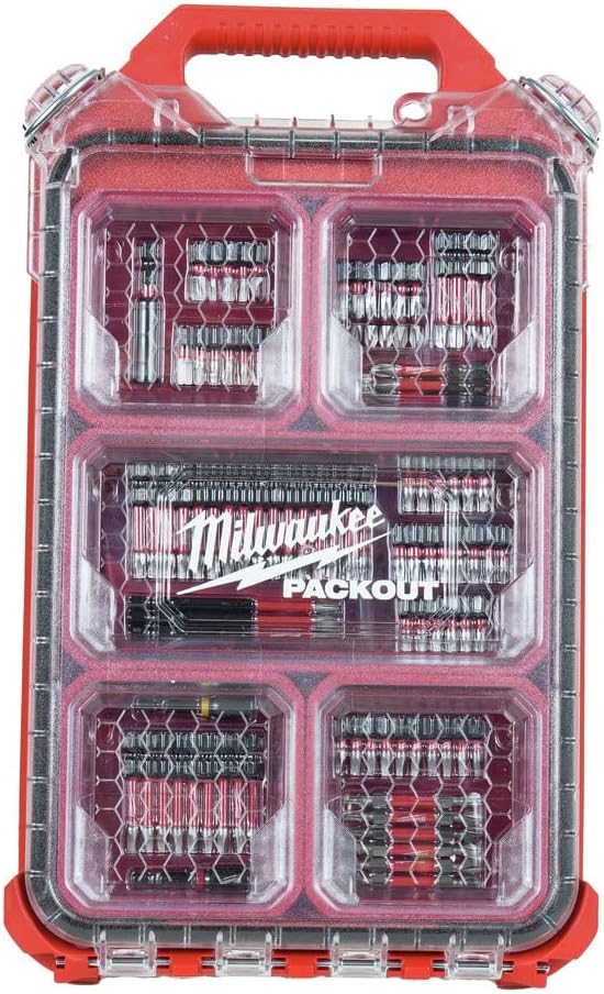 Wear Guard protects fit over the life of the bit optimized in both length and width per tip type for best performance across tip types. Laser hardening at the tip creates an outer protective shield for improved wear resistance. Customized geometry and heat treatment per tip type for best performance across tip types Up to 50X Life vs other impact bits Laser etched size for easy identification Designed for use with Impact Drivers and Drill Drivers (48-22-8436): Slim Design for Organization of Small Items (48-22-8436): IP65 Rated Weather Seal (48-22-8436): No-Travel Bins Seal Prevent Small Part Migration Between Bins (48-22-8436): Clear Top For Easy Identification Of Contents (48-22-8436): Includes 4 small and 1 large bin (48-22-8436): Heavy Duty Latches (48-22-8436): Reinforced Hinge (48-22-8436): Modular Connectivity with PACKOUT Components Includes: (1) 2.36 Compact Bit Holder, (2) 1in PH2, (6) 1inPH2, (2) 1inPR2, (2) 1inPH3, (2) 1in SQ1, (6) 1in SQ2 , (2) 1in SQ3, (2) 1in T10. (2) 1in T15, (6) 1in T20, (6) 1in T25, (2) 1in T27, (2) 1in T30, (1) 1in SL #4, (1) 1in SL #6, (1) 1in SL#8, (1) 1in SL#10, (1) 1in SL #12, (1) 1in Hex 3/32", (1) 1in Hex 7/64", (1) 1in Hex 1/8", (1) 1in Hex 9/64", (1) 1in Hex 5/32", (1) 1in Hex 3/16", (1) 1in Hex 1/4", (2) 2in PH1, (5) 2in PH2, (2) 2in PH3, (2) 2in SQ1, (5) 2in SQ2, (2) 2in SQ3, (2) 2in T10, (2) 2in T15, (5) 2in T20, (5) 2in T25, (2) 2in T27, (1) 3.5in PH2, (1) 3.5in SQ2, (1) 3.5in T25, (1) DE PH2/PH2, (1) DE PH2/ SL#10, (1) DE PH2/T25, (1) DE PH2/SQ2, (1) DE T20/T25, (1) 1 7/8 in Nut Driver -1/4, (1) 1 7/8 in Nut Driver- 5/16