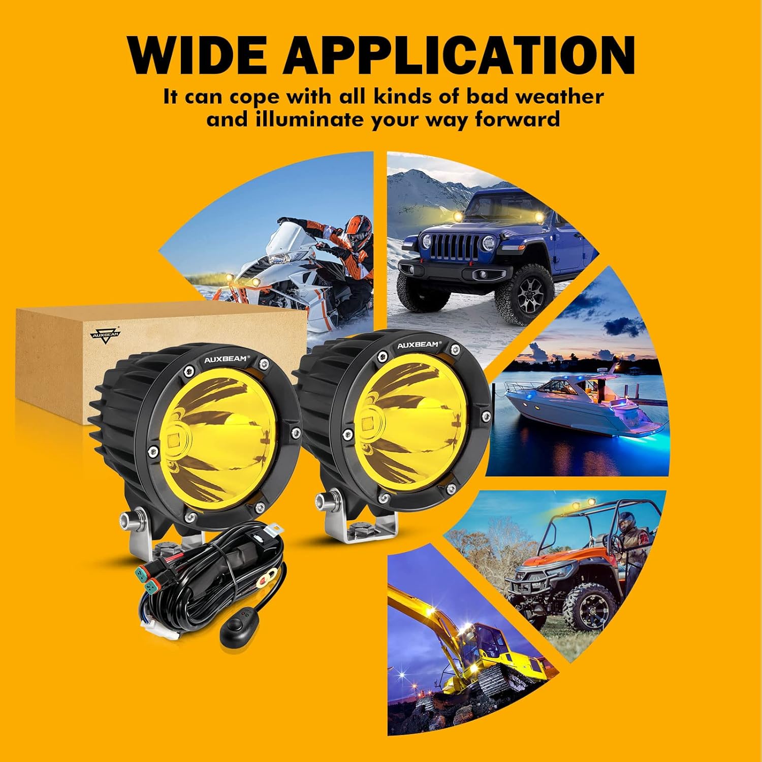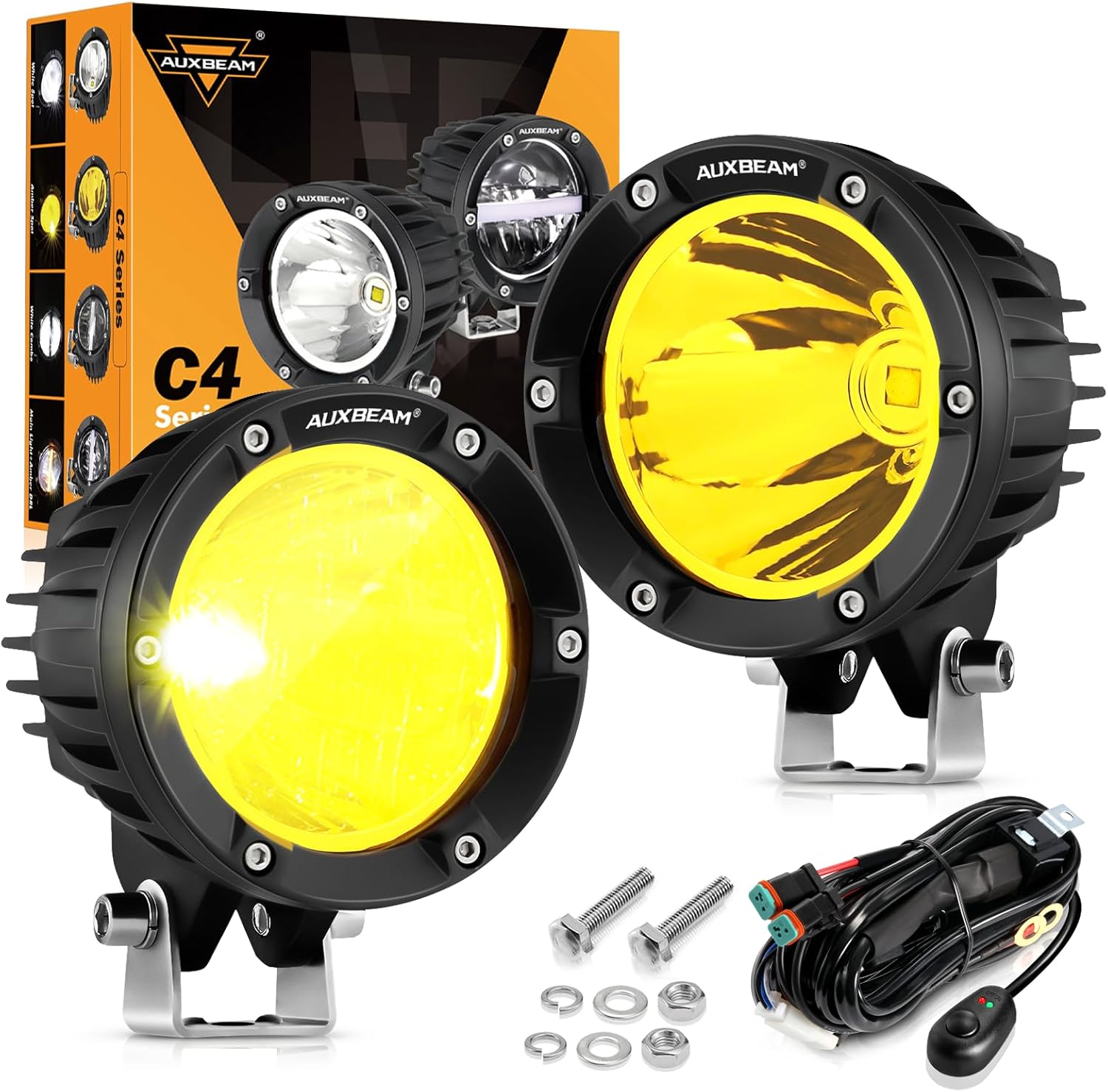 Auxbeam 4 Pulgadas 72W Luces Antiniebla Anaranjadas, 2UD 7200LM LED Redondos Luces Offroad, Barra de Luz de Trabajo Off Road con Kit de Cableado para Vehículos Jeep, Camiones Pick-up, ATV UTV SUV