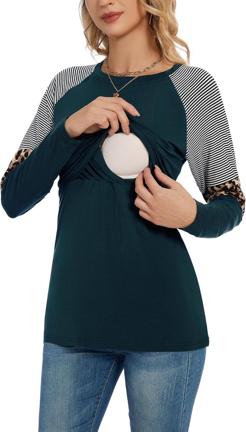 Smallshow Women's Nursing Shirt Top Leopard Block Patchwork Breastfeeding Clothes