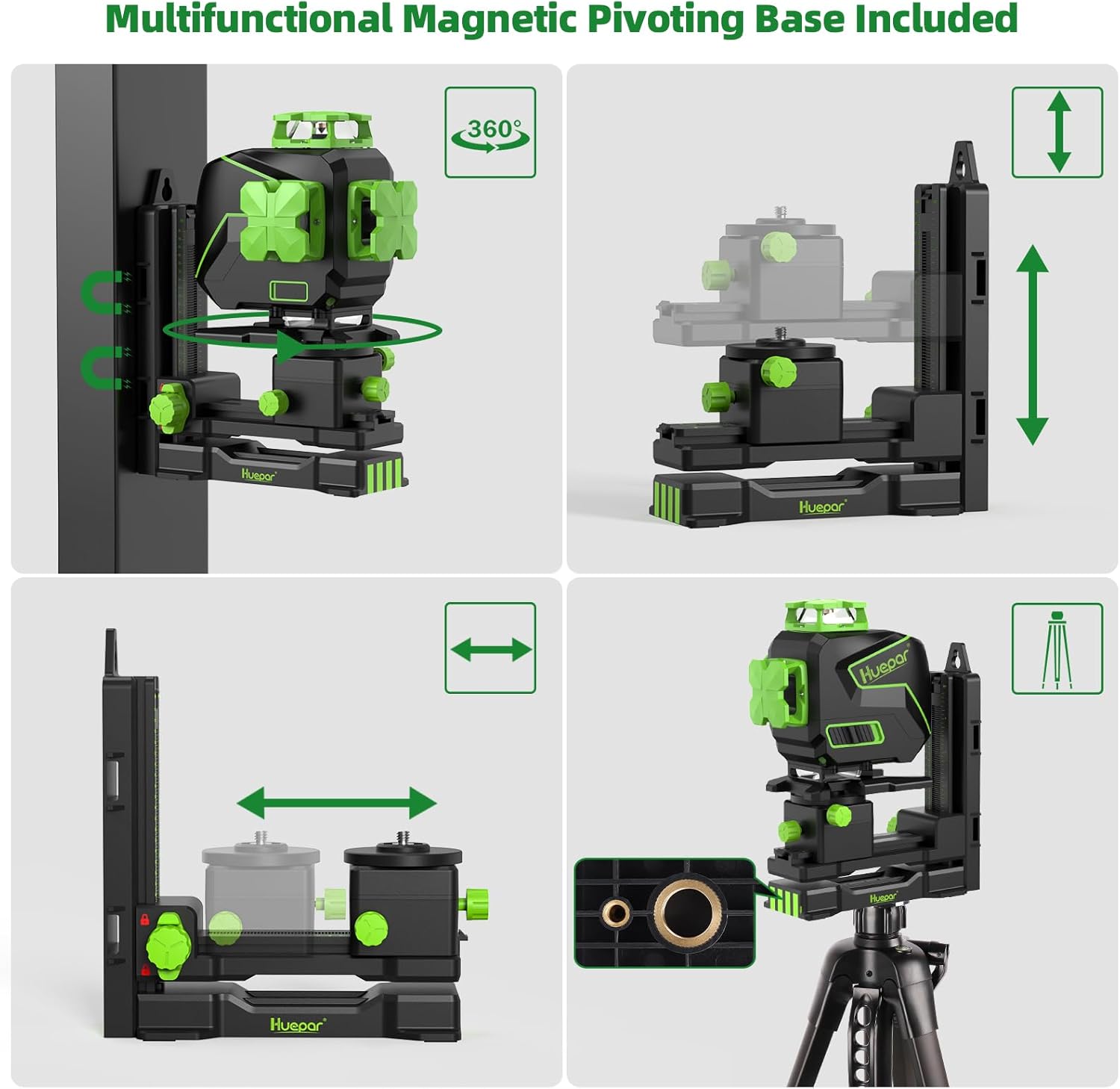 Huepar Laser Level 4 x 360° 16 Lines Self-Leveling Alignment Laser Tool with Pulse Mode for Construction and Picture Hanging, Magnetic Bracket, Lifting Base, Li-ion Battery or 4 AA Batteries - S04CG-L