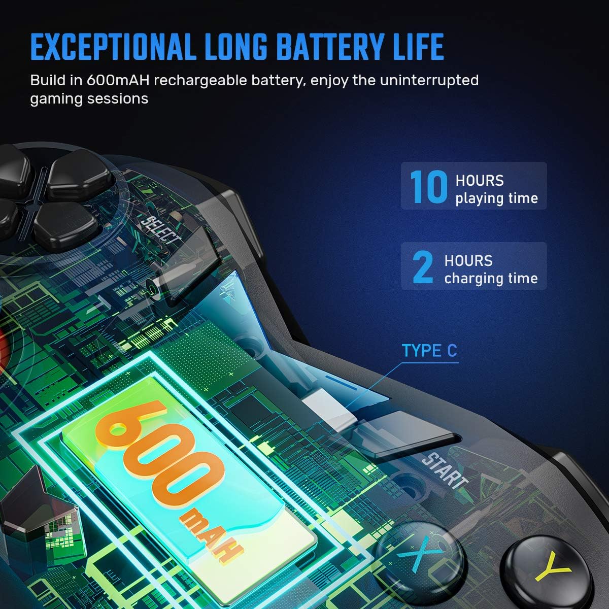 【Immerse yourself in the Game】Turbo Function with Adjustable Speed , Dual Vibration Motors, Streamlined Ergonomics Design and Textured Grip , All of these offers you unparalleled gaming experience. 【600mAh rechargeable battery】provide 10 hours of playtime within 2 hours of charging.