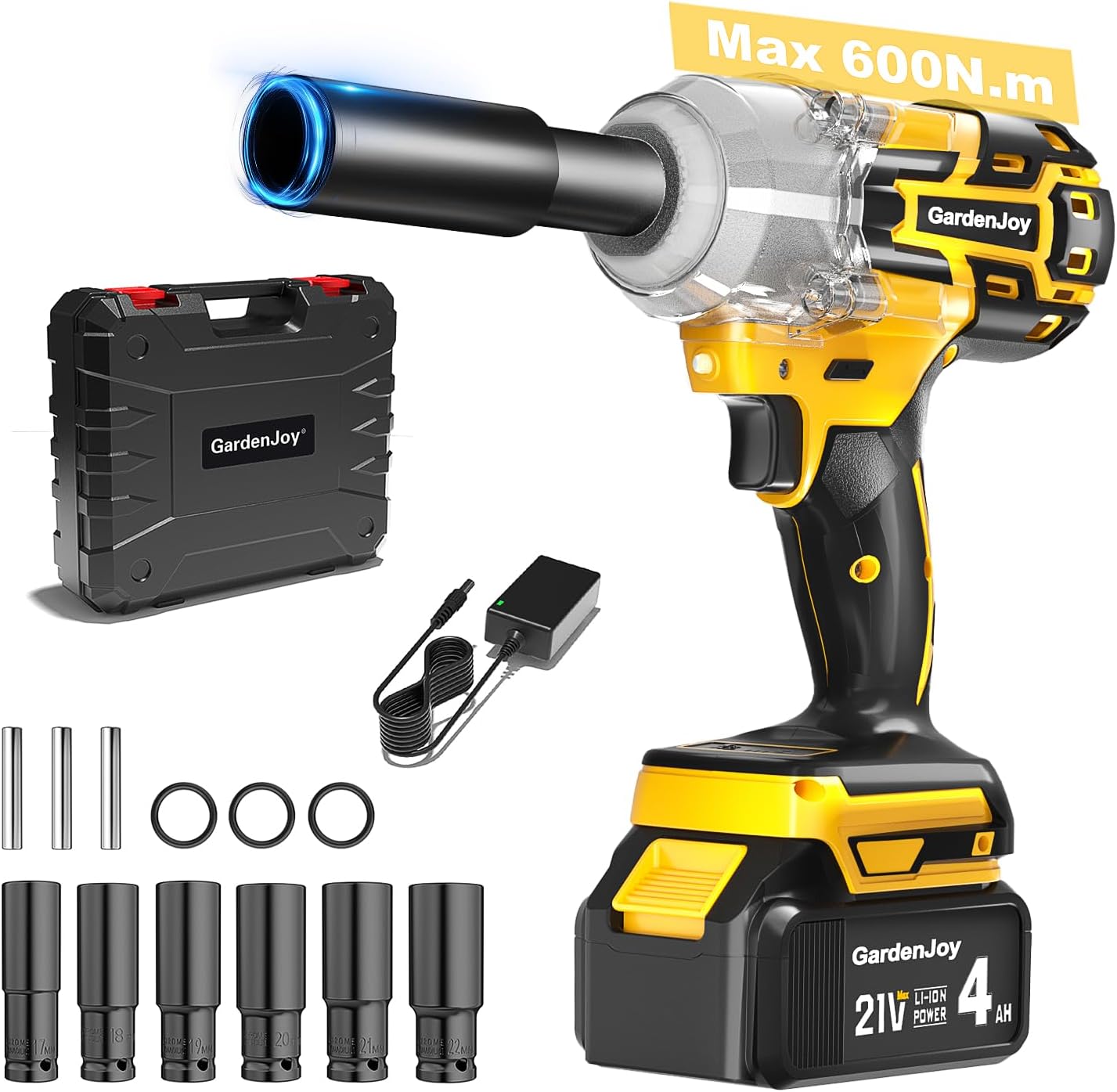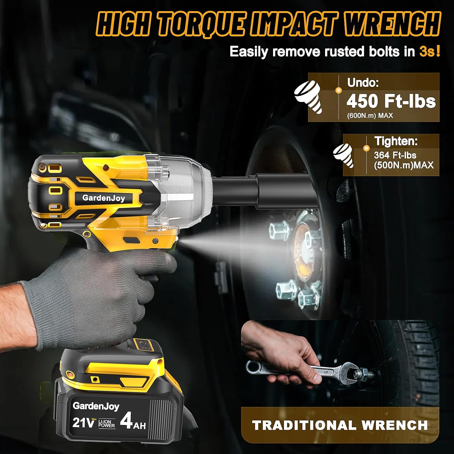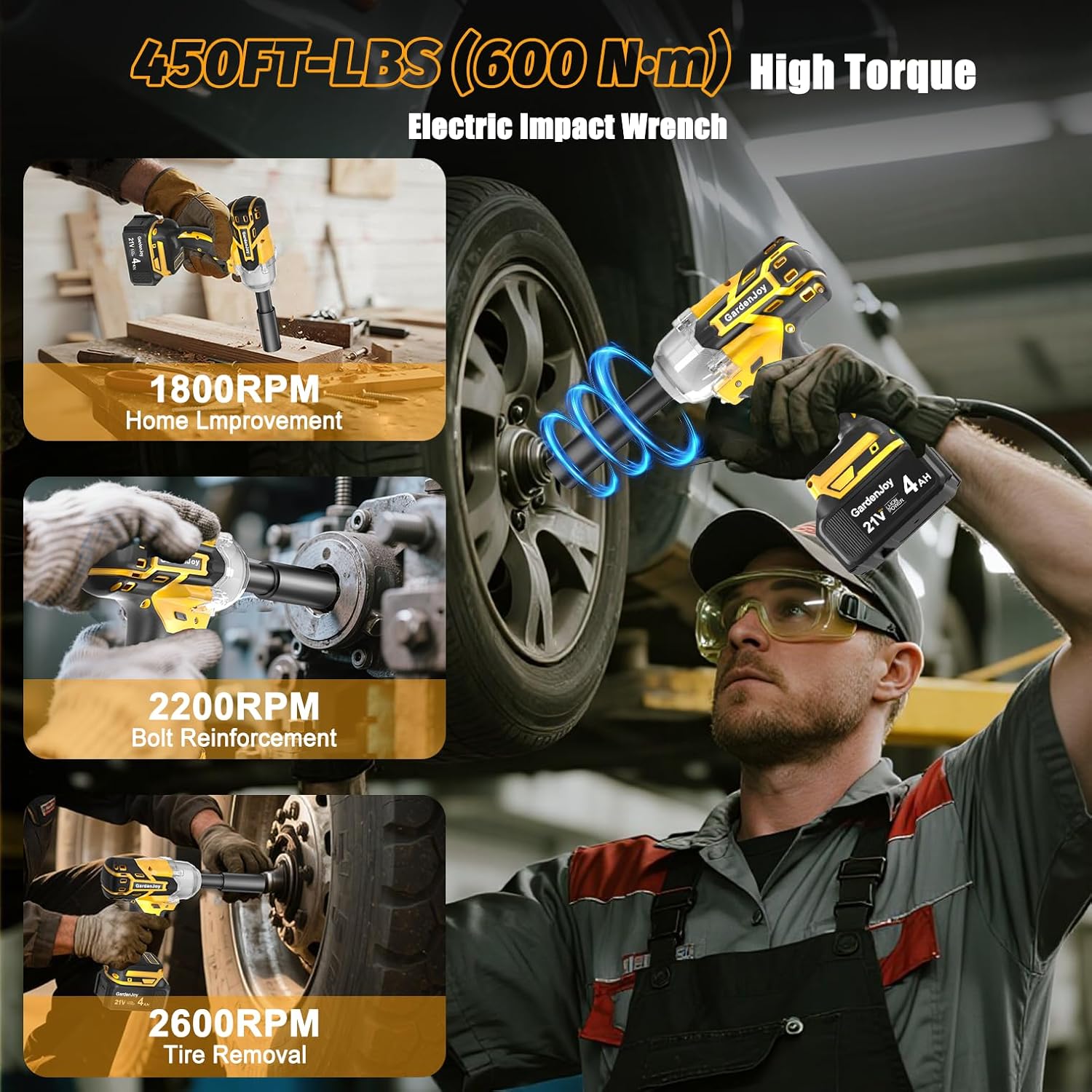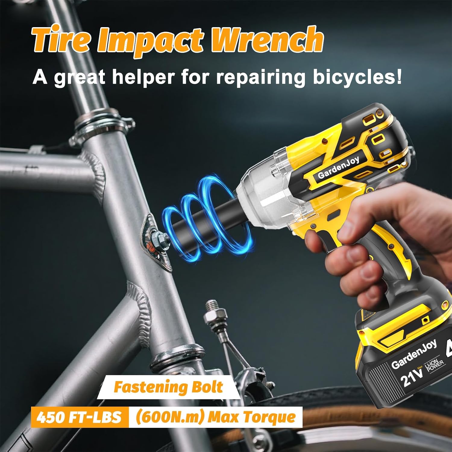 [MOTOR SIN ESCOBILLAS AVANZADO] Llave de impacto para neumáticos equipada con un motor sin escobillas de alto rendimiento, la llave de impacto inalámbrica GardenJoy le ofrece una experiencia más eficiente con menos ruido, mayor duración y sin chispas ni humo. Esta llave de impacto eléctrica tiene un torque máximo de hasta 450ft-lbs (600 N.m) y una velocidad máxima de 2600 RPM.