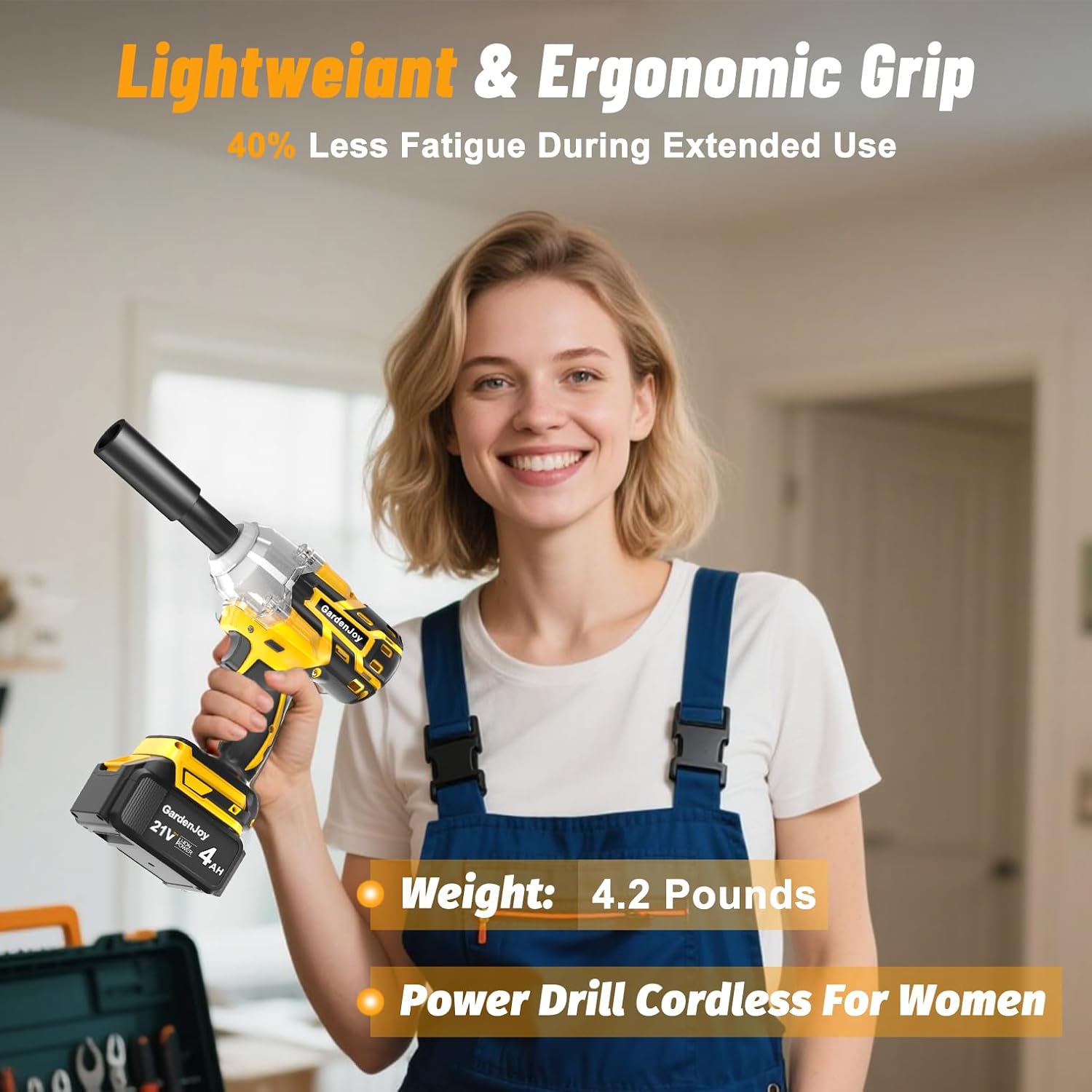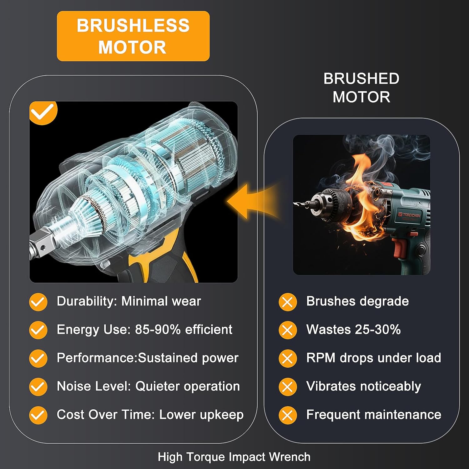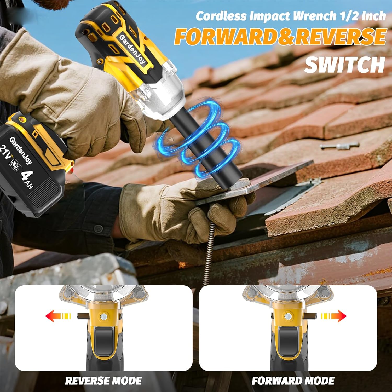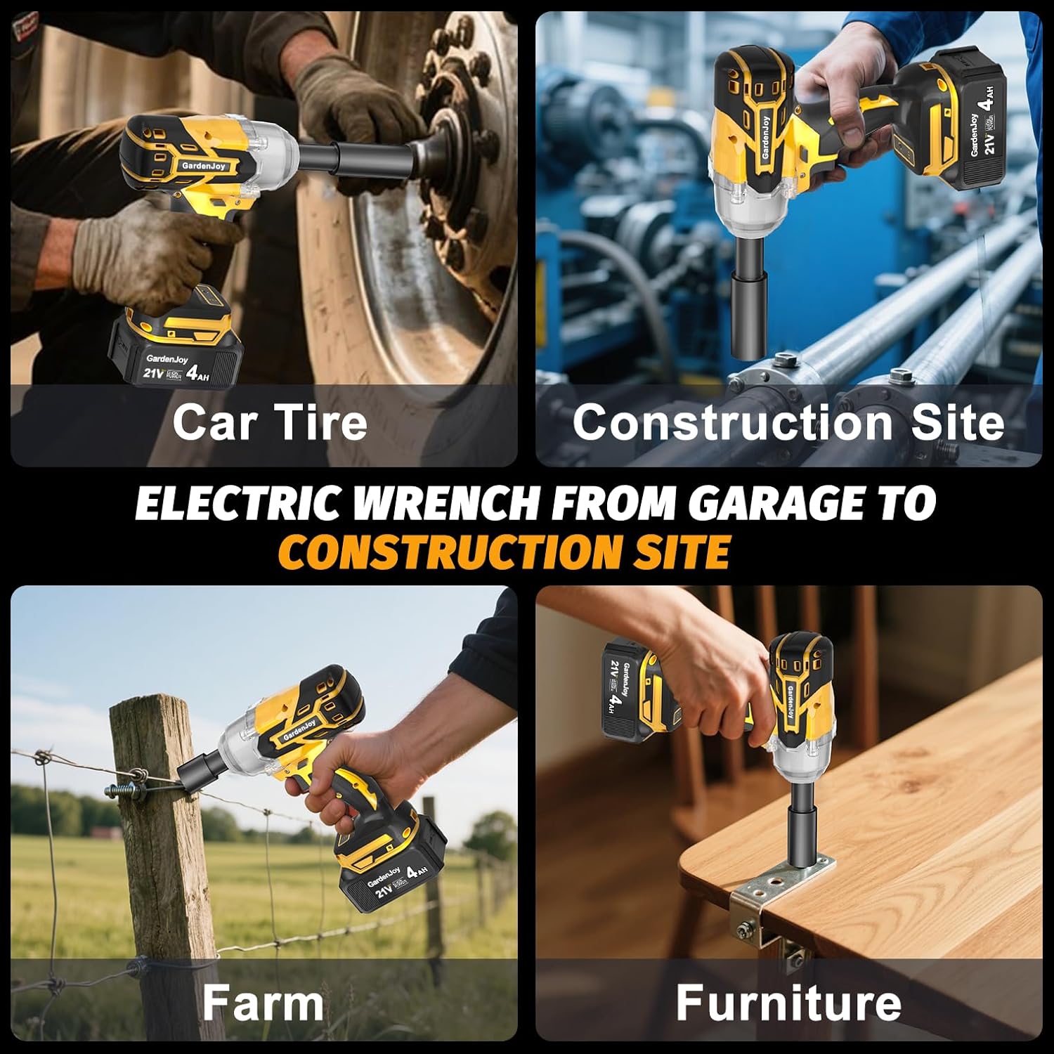 [MOTOR SIN ESCOBILLAS AVANZADO] Llave de impacto para neumáticos equipada con un motor sin escobillas de alto rendimiento, la llave de impacto inalámbrica GardenJoy le ofrece una experiencia más eficiente con menos ruido, mayor duración y sin chispas ni humo. Esta llave de impacto eléctrica tiene un torque máximo de hasta 450ft-lbs (600 N.m) y una velocidad máxima de 2600 RPM.