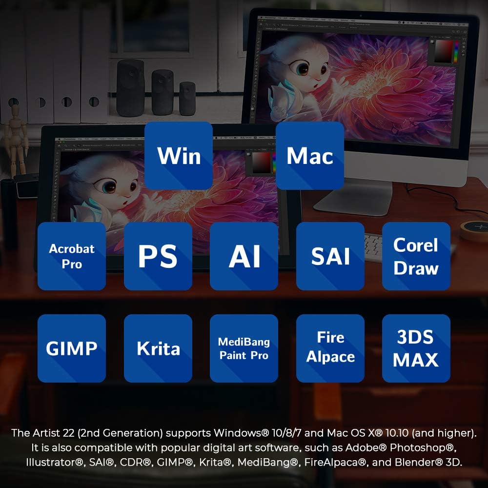 Richer Color Gamut: With a screen color gamut of 86% NTSC (Adobe RGB≥90%,sRGB≥122%), the 22 2nd Display delivers a diverse and vibrant spectrum of colors, allowing you to create vivid artwork enriched by lifelike hues and sharp details