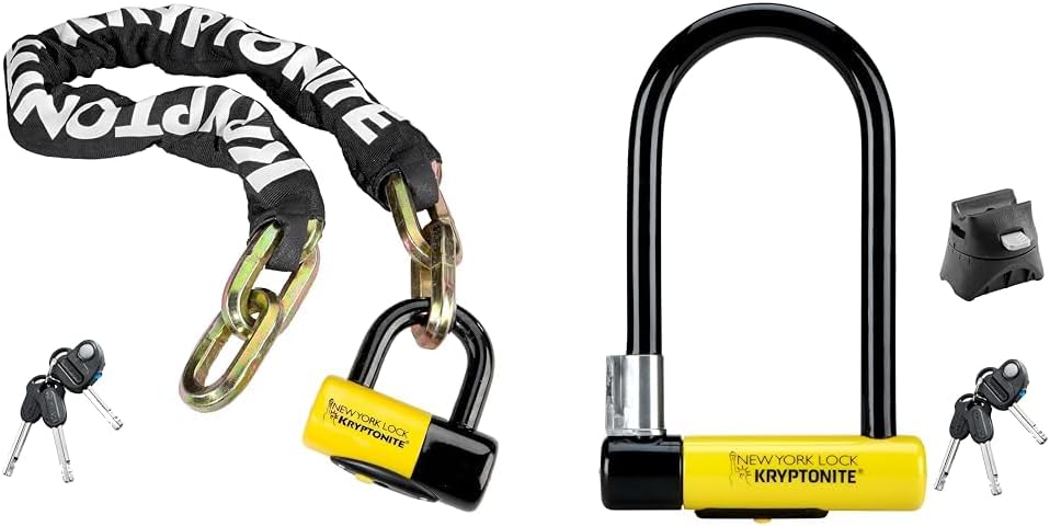 Kryptonite New York FAHGETTABOUDIT 1410 Bike Chain Lock, 3.28 Feet Long 14mm Steel Chain Heavy Duty Anti-Theft Bicycle Chain Lock with Keys, 10/10 Security Rating for E-Bike, Motorcycle, Scooter14mm six-sided chain links made of 3t HARDENED MANGANESE STEEL for ultimate strength. Durable, protective nylon cover with hook-n-loop fasteners to hold in place. Includes maximum security New York Disc Lock with 15mm MAX-PERFORMANCE STEEL SHACKLE. Patented*, oval hardened STEEL CROSSBAR for extra security. Hardened DOUBLE DEADBOLT locking for extensive holding power. HIGH SECURITY DISC-STYLE CYLINDER with reinforced anti-drill, anti-pull protection system. SLIDING DUSTCOVER protects and extends cylinder life. 3 STAINLESS STEEL KEYS – one lighted with high intensity bulb and replaceable battery. Key Safe Program.Product dimensions: 3.25’ (100cm) chain length, 15mm shackle diameter.Kryptonite Heavy Duty Key Lock, Black/Yellow, 4in x 8in, Anti-Theft Protection IncludedThe Kryptonite New York Lock Standard U-Lock features a 16 mm hardened max performance steel shackle with a double deadbolt anti-rotation design that resists bolt cutters and twisting leverage attacks. The lock’s disc-style cylinder with center keyway is protected by a vinyl coating and is pick and drill resistant. The keyway also features a sliding dust cover to protect the cylinder from dirt and debris when not in use. It includes three stainless steel keys with an ergonomic design to reduce torque and keep them from bending or breaking. One of the keys has an LED key fob for added visibility in the dark. Rated at 9 / 10 on our security scale, the New York Lock Standard is good for quick stops in major metropolitan areas and all day & overnight on college campuses, suburbs, and rural areas. It also includes our patented FlexFrame-U Bracket providing convenient multi-location U-Lock transport. The combination of these great features and our support programs including Key Safe, Anti-Theft Protection..