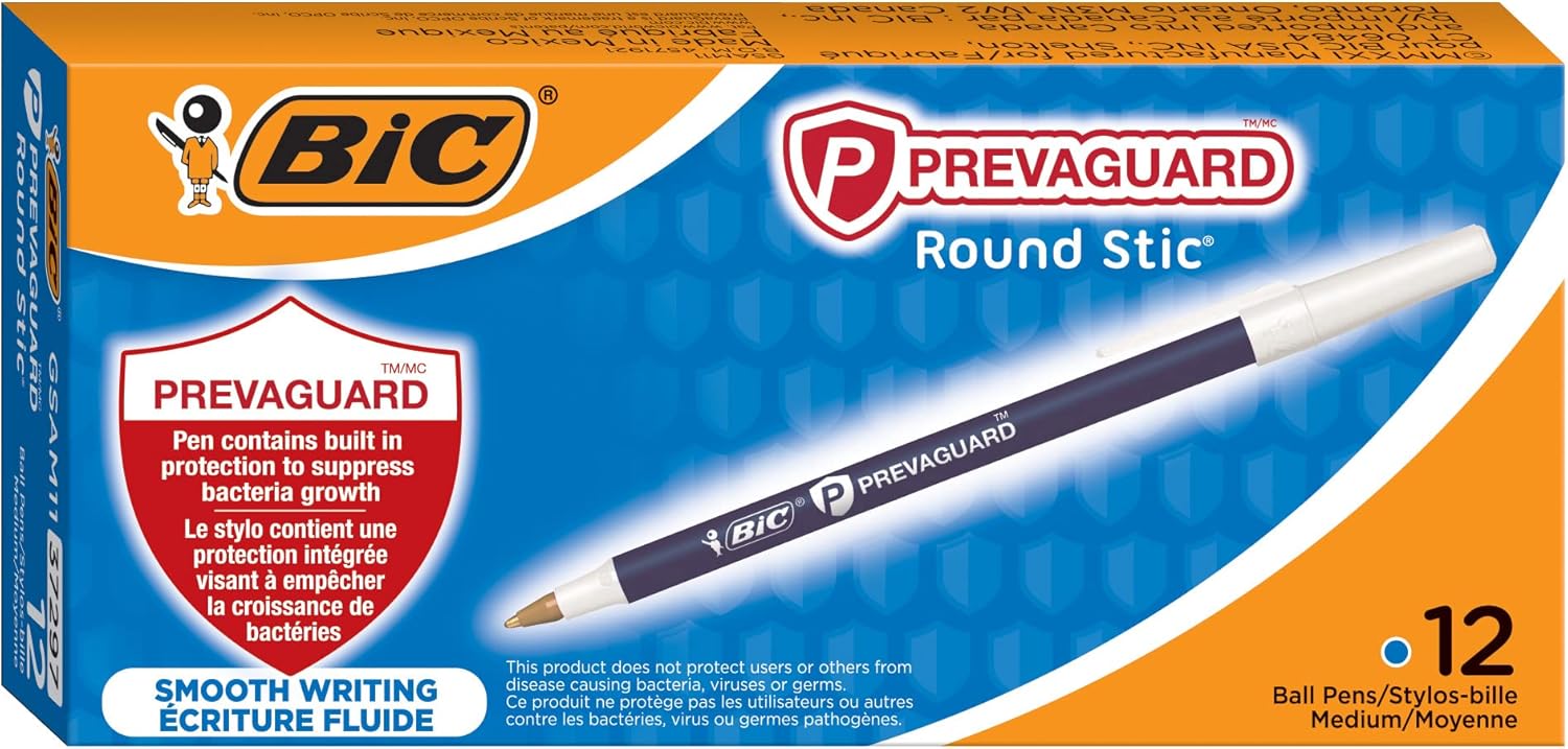 El bolígrafo BIC Prevaguard Round Stic contiene un agente incorporado en el plástico que protege el bolígrafo en sí suprimiendo el crecimiento de bacterias, algas, hongos y moho. Estos productos protegen los bolígrafos en sí y no protegen a los usuarios u otros de bacterias, virus o gérmenes causantes de enfermedades. El agente debería durar toda la vida del plástico del bolígrafo a menos que se destruya el plástico. Además del agente en el bolígrafo, el bolígrafo Round Stic es el producto BIC que conoce y ama. El bolígrafo BIC Round Stic escribe un 90% más que el Papermate InkJoy ST100, brindándole un gran valor por su dinero. Este bolígrafo también cuenta con una punta de bola de 1.0 mm que ofrece una escritura suave para crear líneas vívidas y altamente visibles ideales para tomar notas, redactar, dibujar y otras actividades de escritura.