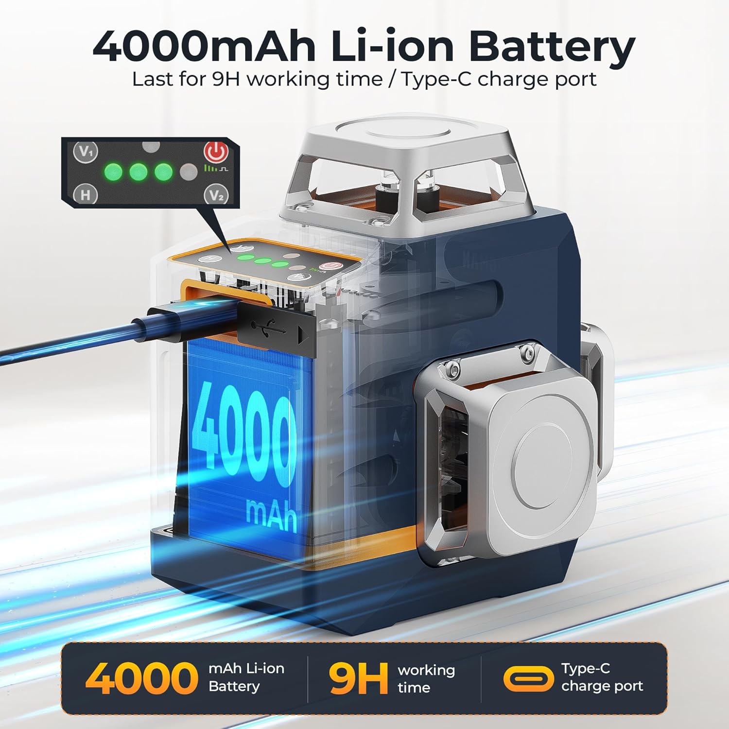 Batería de Larga Duración con Carga Rápida: La herramienta nivel láser CIGMAN con batería recargable incorporada de 4000mAh, proporciona este láser de línea con tiempo de operación extendido para un trabajo ininterrumpido. El puerto de carga Type-C admite carga rápida y versátil desde bancos de energía, portátiles o adaptadores de pared, haciendo que este láser de construcción sea confiable para proyectos largos.