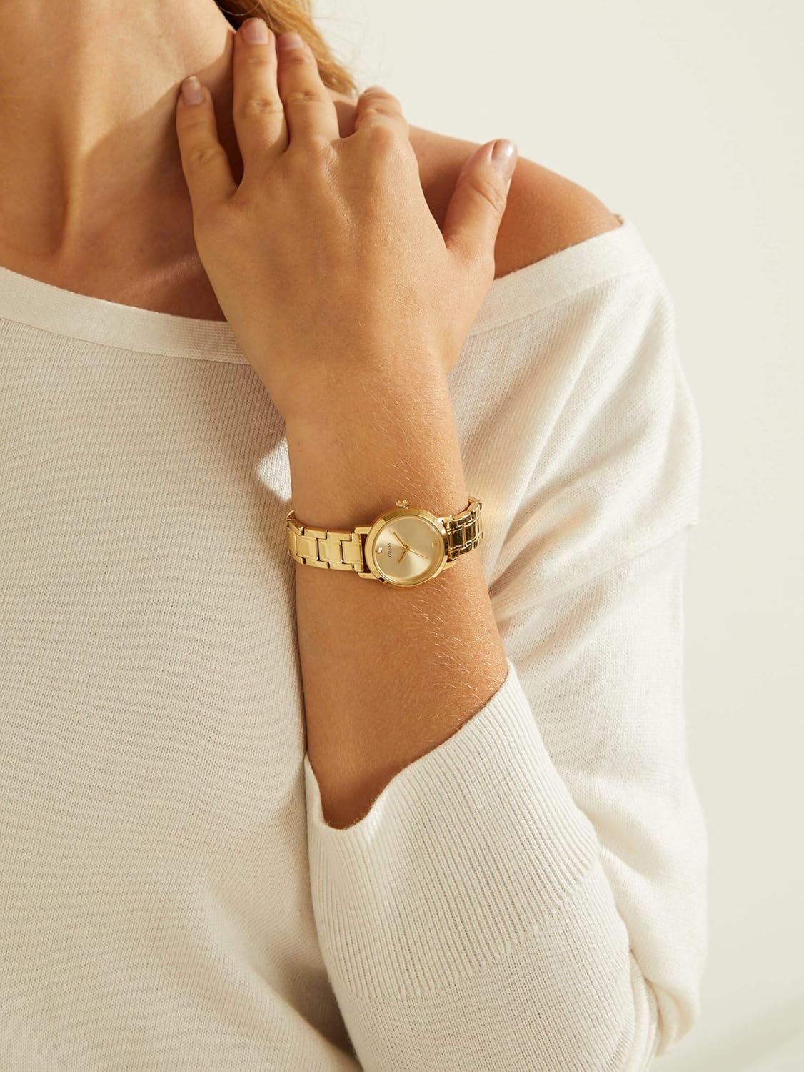 Consigue un acabado elegante y clásico con este pequeño reloj analógico, diseñado en acero inoxidable tono dorado, con una marca y brazalete de diamantes genuinos.