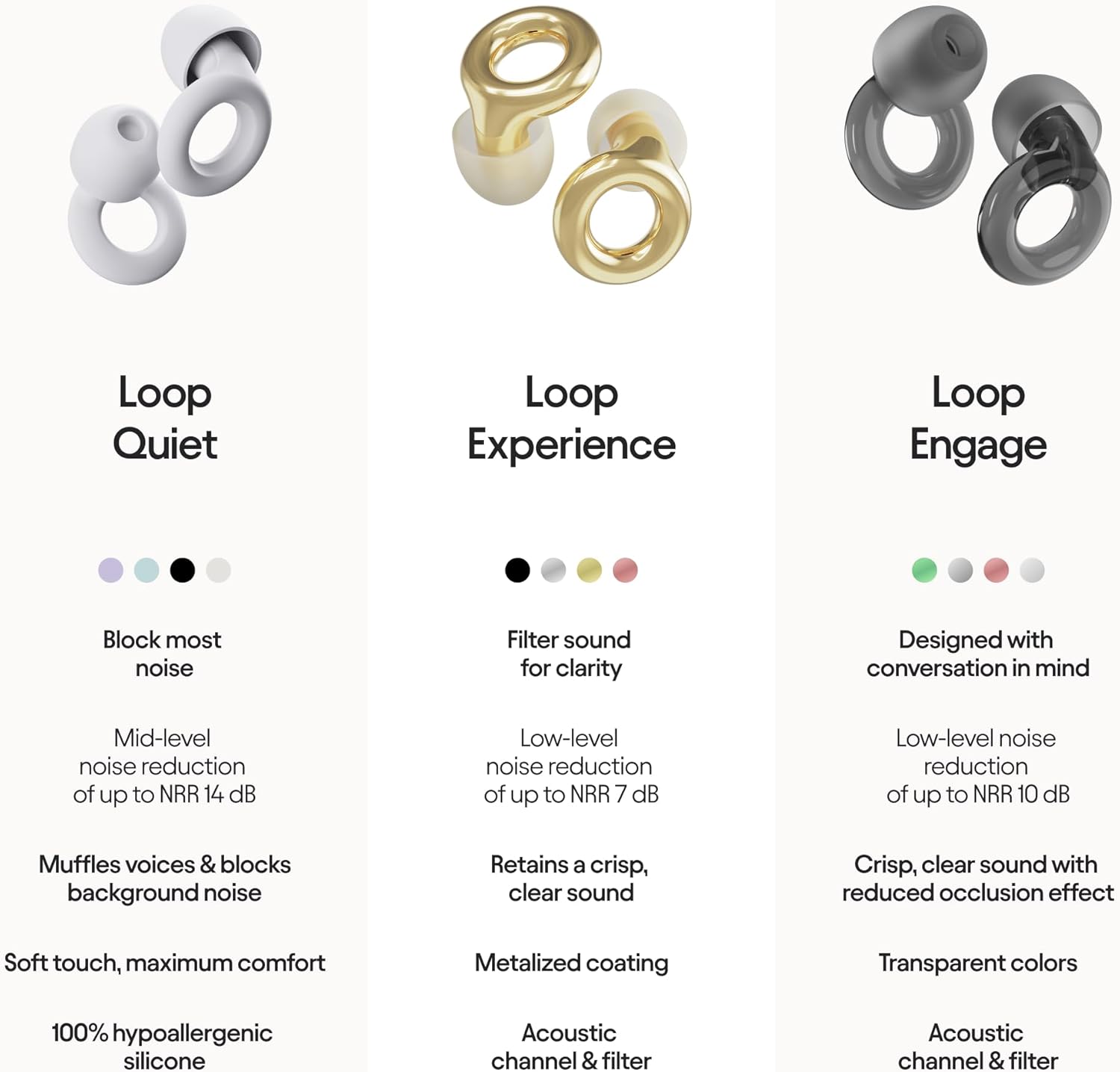 Reducción de ruido: los tapones para los oídos Loop Experience son tapones de alta fidelidad que reducen el ruido y garantizan que sigas oyendo todo, solo que un poco menos fuerte. Tienen una clasificación de reducción de ruido (SNR) de 18 decibelios, una NRR de 7 y vienen en 4 elegantes colores.