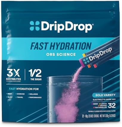 Paquetes de Hidratación DripDrop - Paquete Variado Atrevido - Mezcla en Polvo de Electrolitos para Bebidas de Servicio Individual - Sandía, Bayas, Limón, Naranja - No OGM, Sin Gluten, Vegano - 32 Sobres