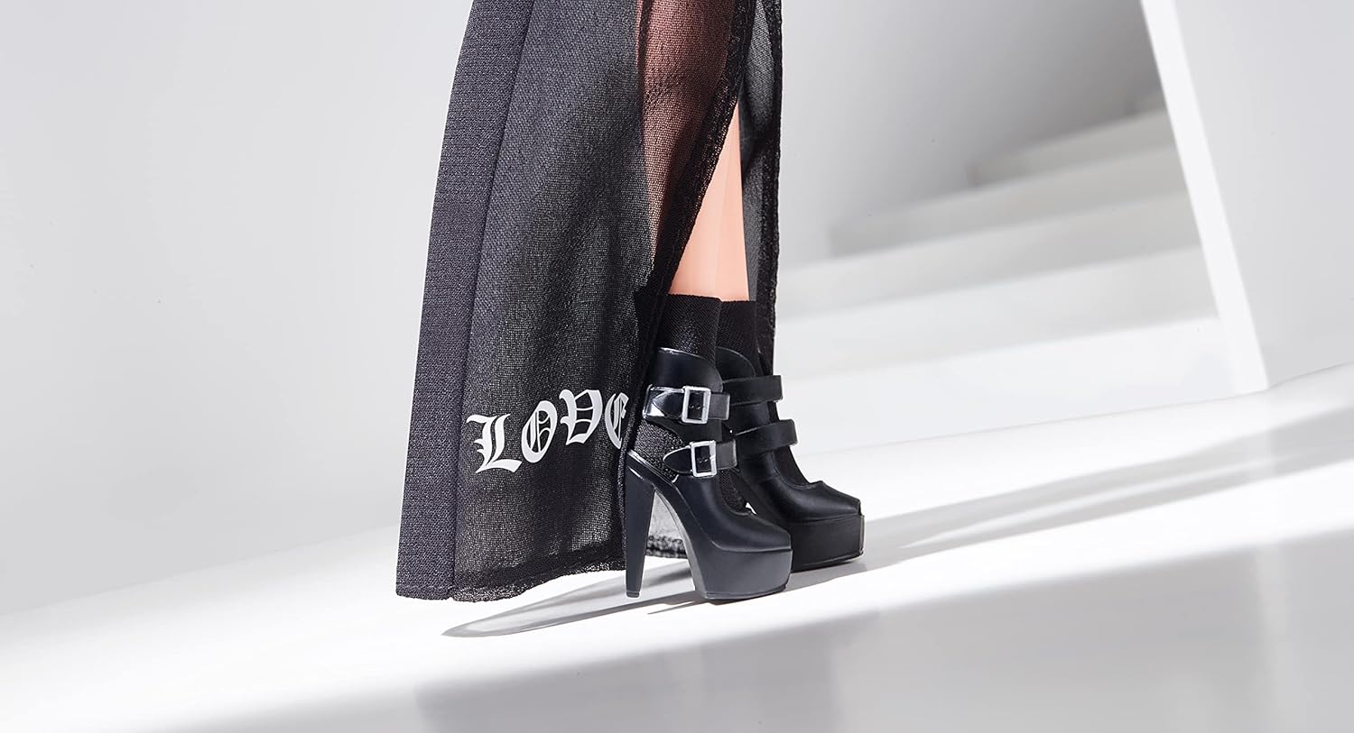 Un cinturón peplum con detalle de cremallera, calcetines negros y tacones de plataforma con detalles de hebilla esculpida completan su look.