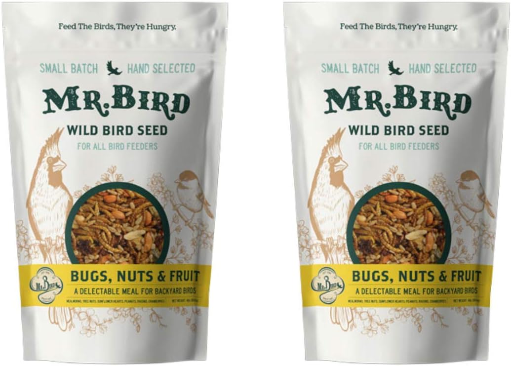 Keep your birds flocking to the feeder with the Mr. Bird Bugs, Nuts, & Fruit Large Loose Seed Bag. This year-round seed blend contains loads of mealworms, tree nuts, peanuts, sunflower hearts, raisins and cranberries and offers a delectable feast for your birds. There is nothing else that will attract a greater variety of birds. In a resealable 4-pound bag, this seed blend will stay fresh and safe from spoilage while keeping your birds fed longer. Proudly made in small batches in the USA.