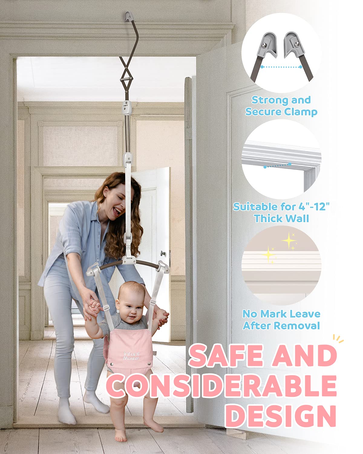 CONVENIENTE PARA EL HOGAR O VIAJES - Fácil de instalar sin herramientas, abre el clip y fíjalo en el pasillo (4-12'' de grosor). La estructura plegable y portátil del saltador de puerta pesa 3 libras, lo cual lo hace fácil de guardar en la bolsa o maleta de la mamá. Trae más diversión al bebé dondequiera que vayas.