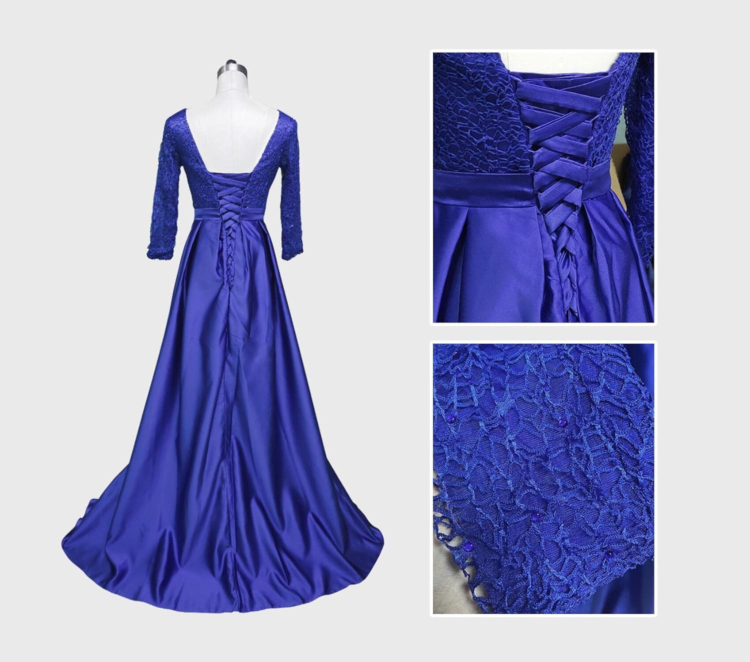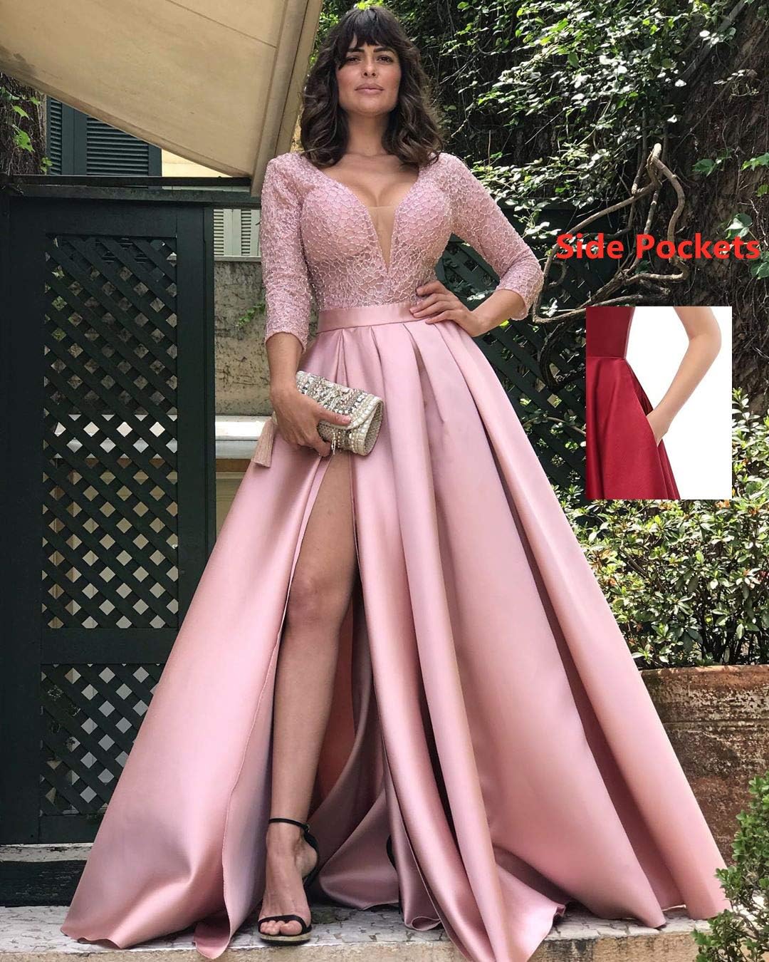 Chicbridal Deep V-Neck Prom Dresses Satin 3/4 Sleeves Evening Party Gowns with Pockets for Women