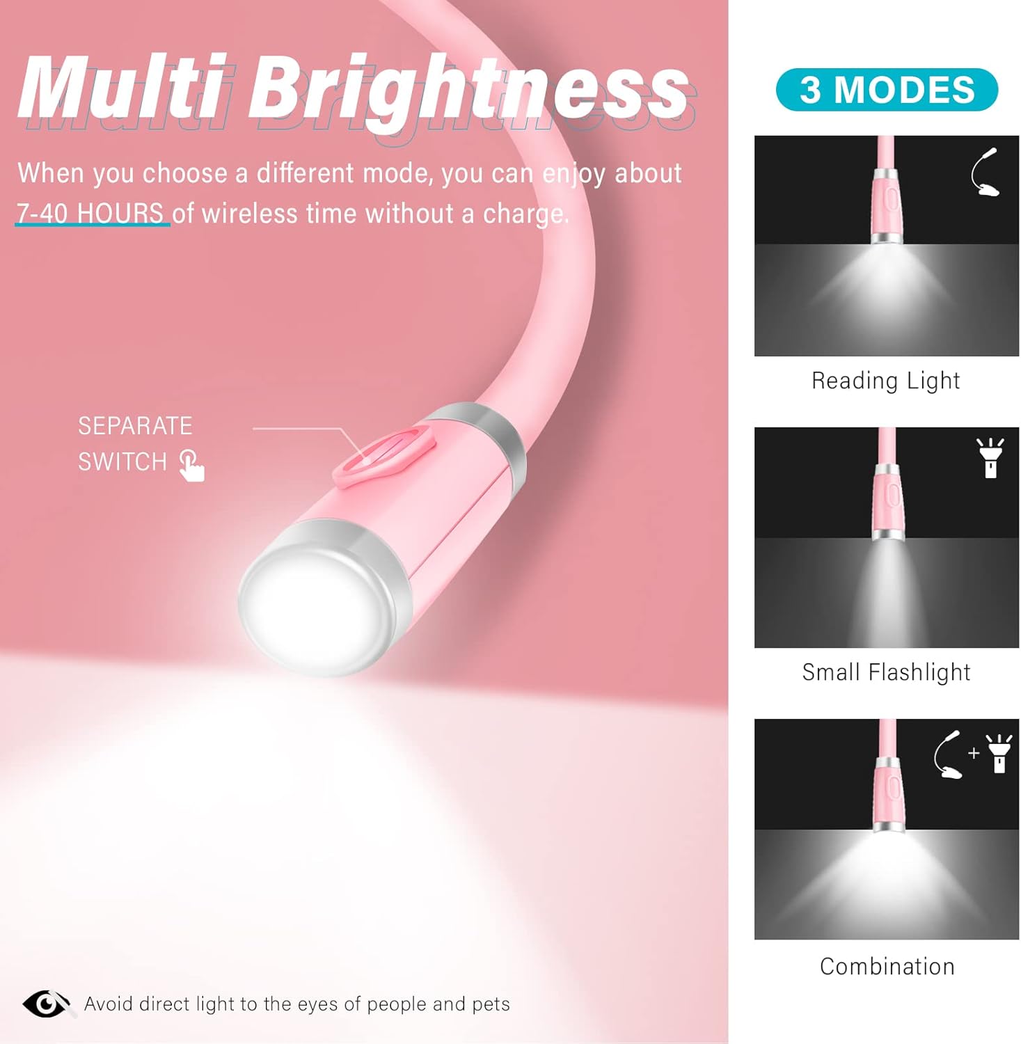 Vekkia Rechargeable LED Neck Reading Light, Book Lights for Reading in Bed, 3 Brightness Levels, Flexible Soft Silicone Arms Comfortable Wear, Long Lasting, Perfect for Craft & Knitting, Pink