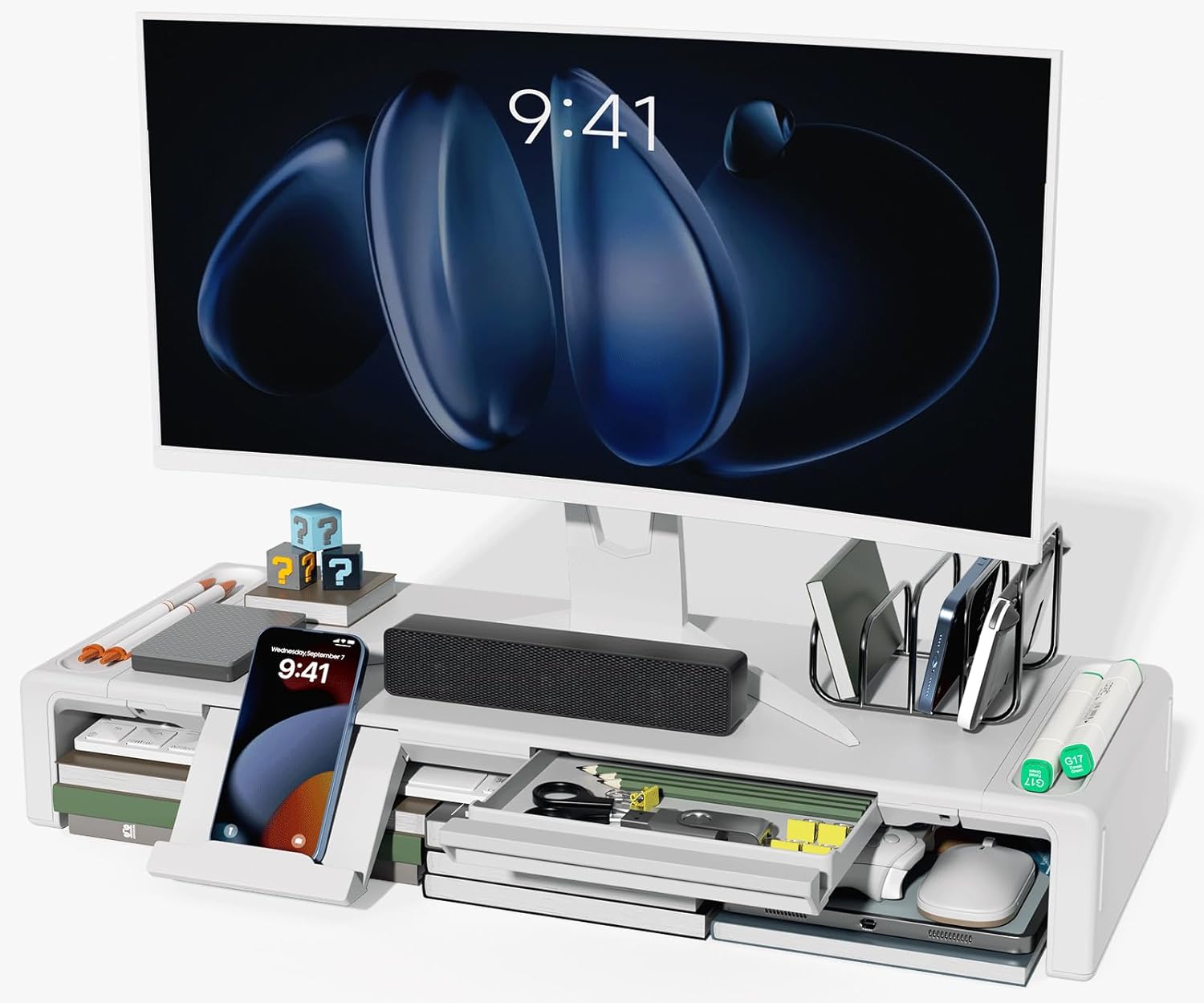Soporte elevador para monitor OImaster, soporte plegable para monitor de computadora, soporte de longitud ajustable con cajón de almacenamiento y ranura para bolígrafo, compatible con computadora, escritorio, portátil, ahorra espacio (blanco)