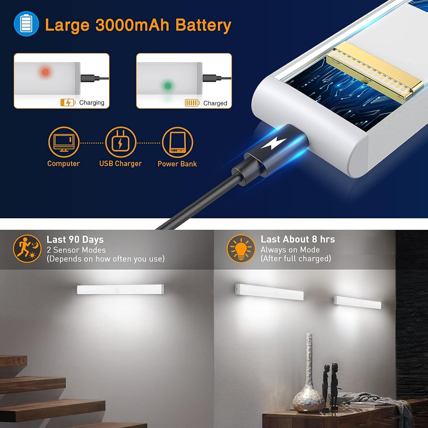 LARGE BATTERY & 4 CYCLE MODES -- MODE 1: Motion & Light Sensor Mode (Green light flash 1s), MODE 2: Only Motion Sensor Mode (Blue light flash 1s), MODE 3: Always On Mode ( Red light flash 1s, MODE 4: OFF. Built-in 3000mAh ultra-long battery life, it can last up to 90 days when it's at Motion Sensor Modes. It can be recharged by any USB charging port, like plug, power bank or laptop.