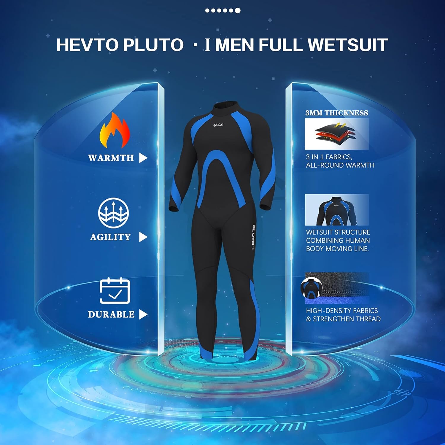 El traje completo Hevto Pluto · Ⅰ para Hombre es principalmente negro con rayas azul real. La impresión "PLUTO · Ⅰ" en los pantalones es reflectante por la noche. Un traje de neopreno bien ajustado te hará lucir más en forma y profesional.
