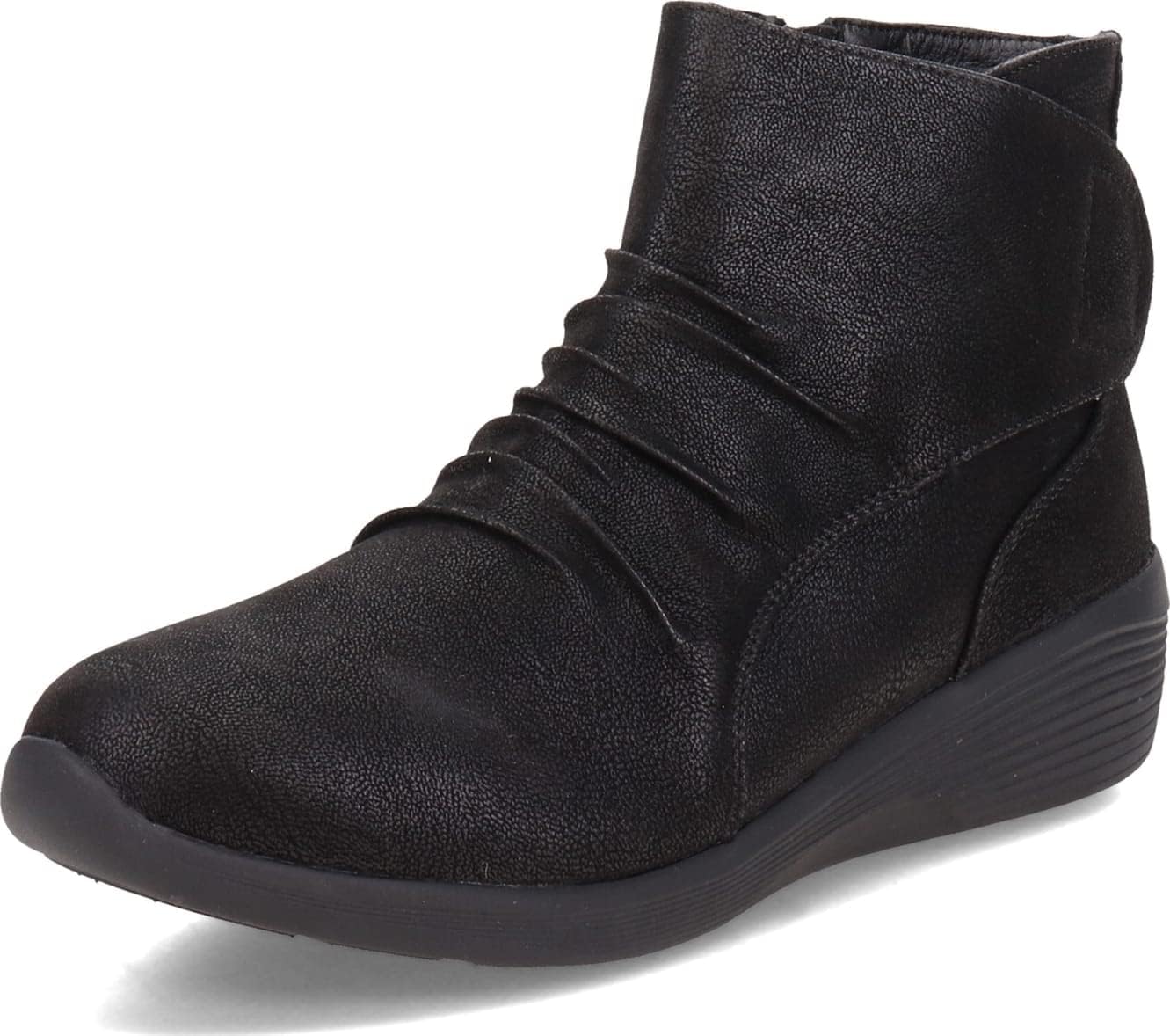 Parte superior de microfibra con textura de cuero suave en una bota casual de confort de altura de tobillo con cierre lateral y plantilla de espuma de memoria enfriada por aire.