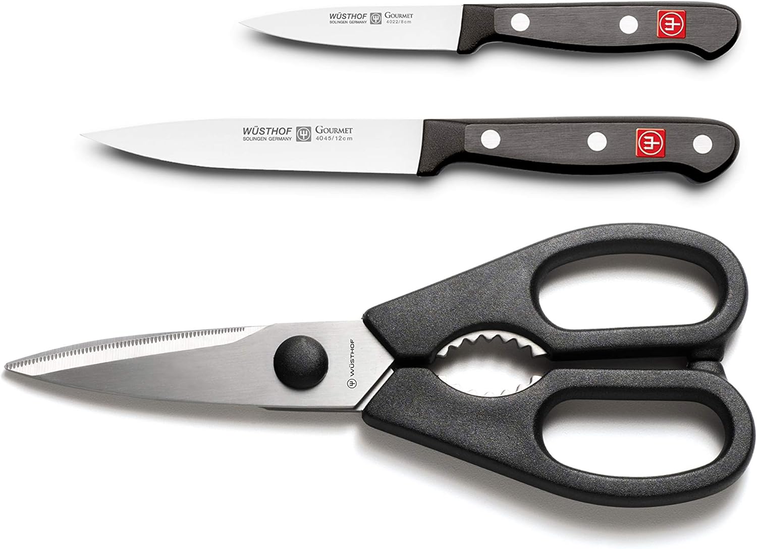 WÜSTHOF GOURMET SERIES – 3 Piece Knife Set with triple riveted synthetic polypropylene handles that resist fading, discoloration, heat and impact. Precisely laser-cut stamped knives offer superb quality and value