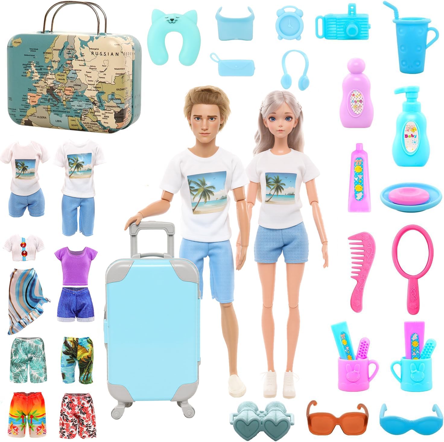 Miunana 29pcs Doll Travel Clothes and Accessories Blue Trunk Suitcase 2 Girl Clothes 1 Boy Doll Clothes 8 Life Accessories 12 Wash Accessories Telescope Sunglasses