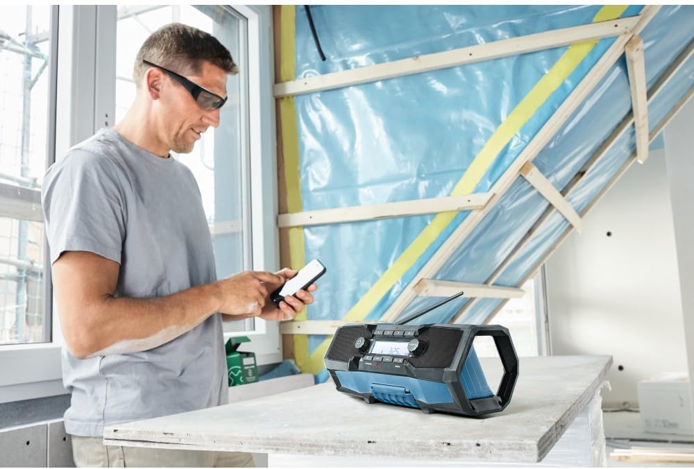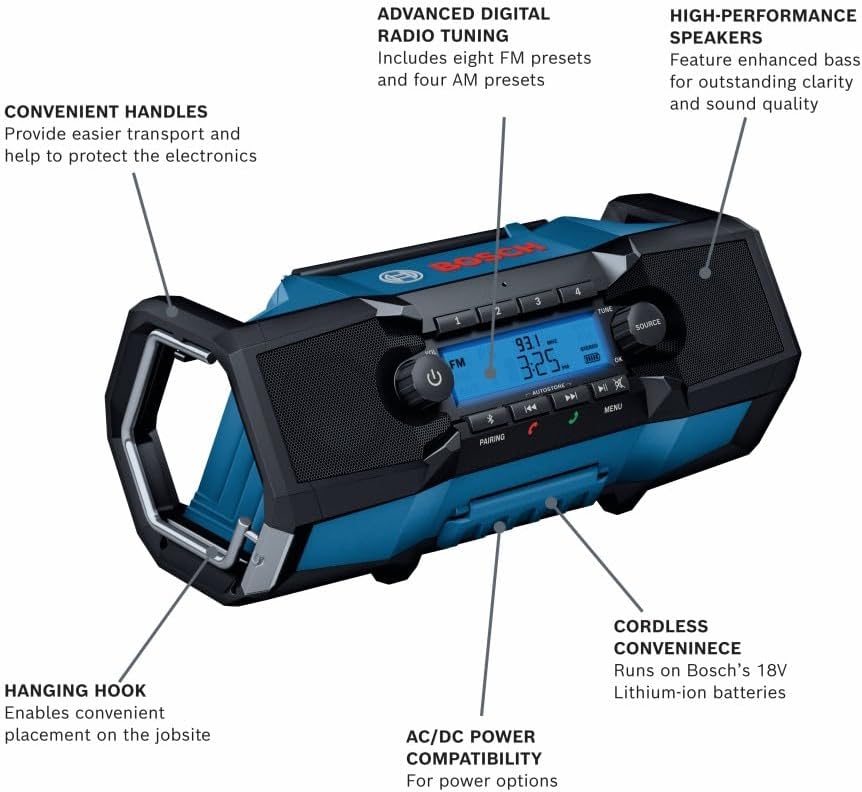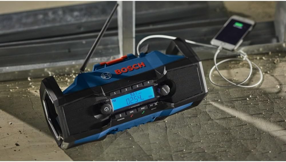 El Bosch GPB18V-2C es una radio inalámbrica portátil y flexible para el lugar de trabajo con tecnología Bluetooth® 5.0. Los altavoces de alto rendimiento con una respuesta de graves mejorada ofrecen una claridad y calidad de sonido sobresalientes. La conectividad Bluetooth® permite a los usuarios escuchar su servicio de streaming de música favorito, incluyendo Pandora®, Spotify® y Apple Music®, o canciones almacenadas a través de su dispositivo móvil (hasta a 30 metros de distancia). Se incluye una conexión AUX IN para reproductores de MP3 o receptores de satélite portátiles. Además, la unidad incluye sintonización de radio digital con ocho preajustes de FM y cuatro de AM. Mantener los dispositivos móviles cargados y listos es fácil con el puerto USB incorporado. Los mangos convenientes y el gancho de colgar hacen que esta radio sea fácil de llevar y colocar en el lugar de trabajo, taller o donde sea que se reproduzca. La alimentación es proporcionada por las baterías de iones de litio de 18V de Bosch (vendidas por separado) o el adaptador de CA/CC incluido. Cuenta con una construcción resistente para el lugar de trabajo y tiene una clasificación IP54.