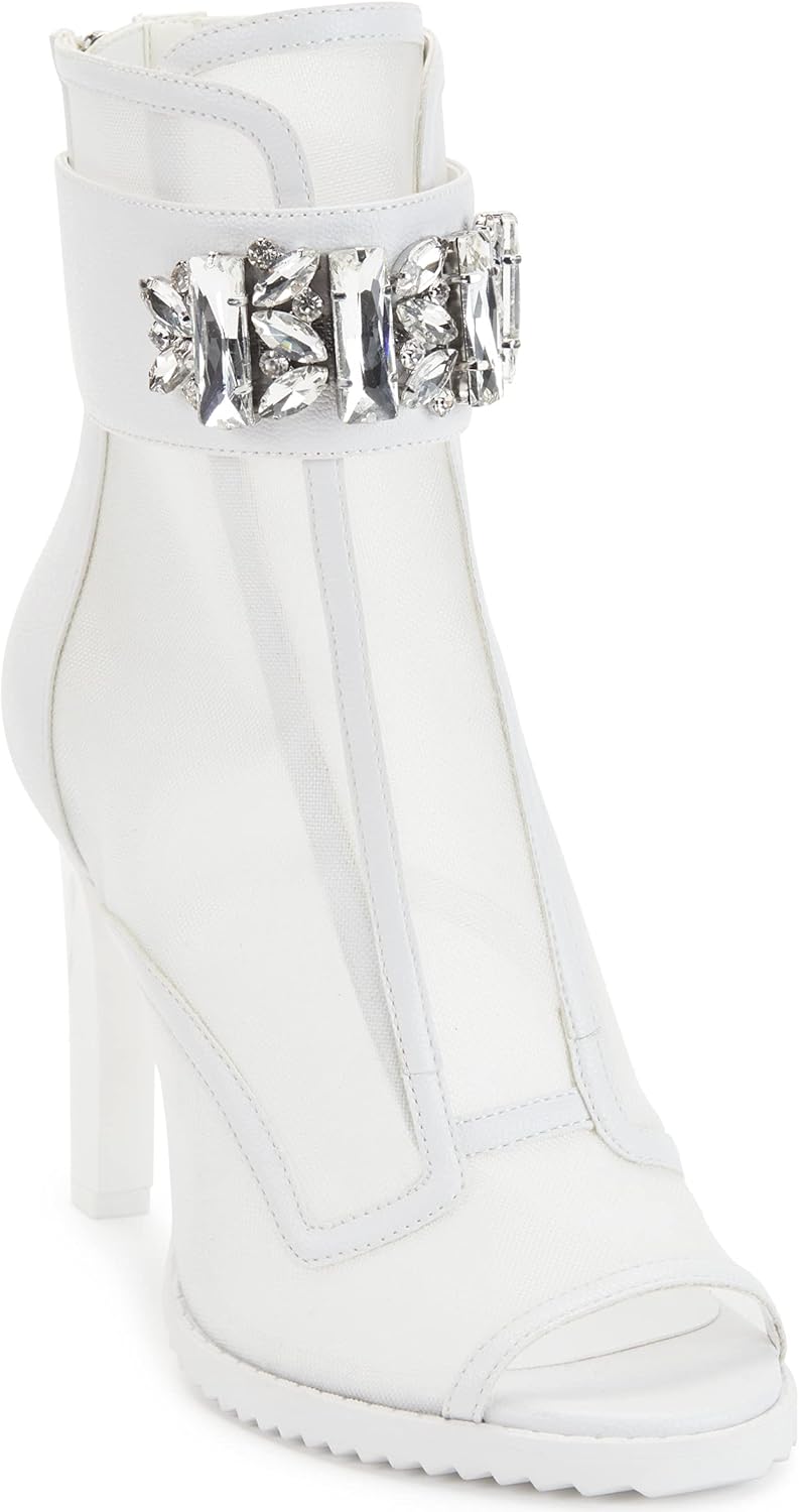 Heeled mesh bootie with peep toe, jewel embellishment on upper, zipper closure on counter, mini sawtooth bottom, memory foam footbed