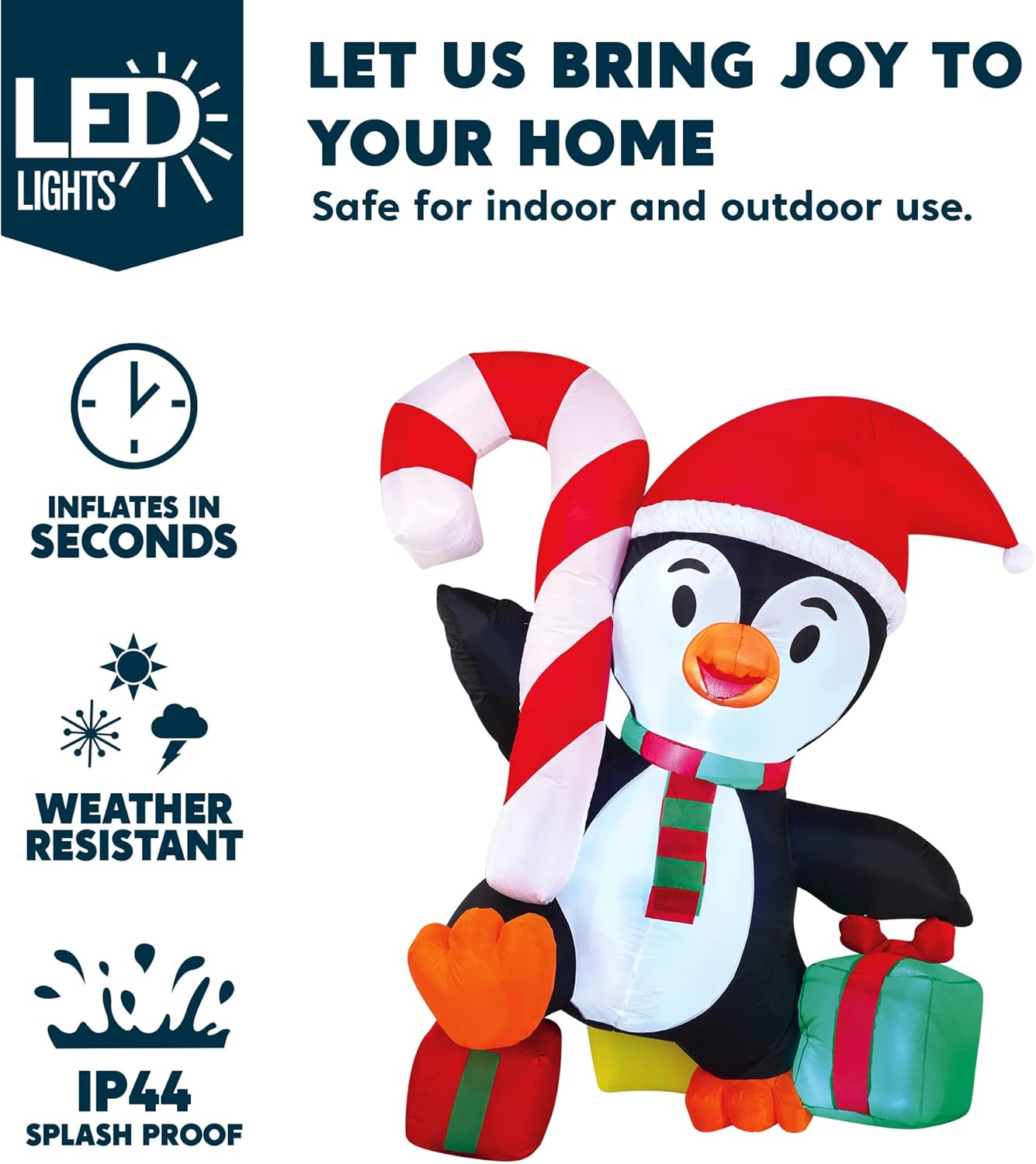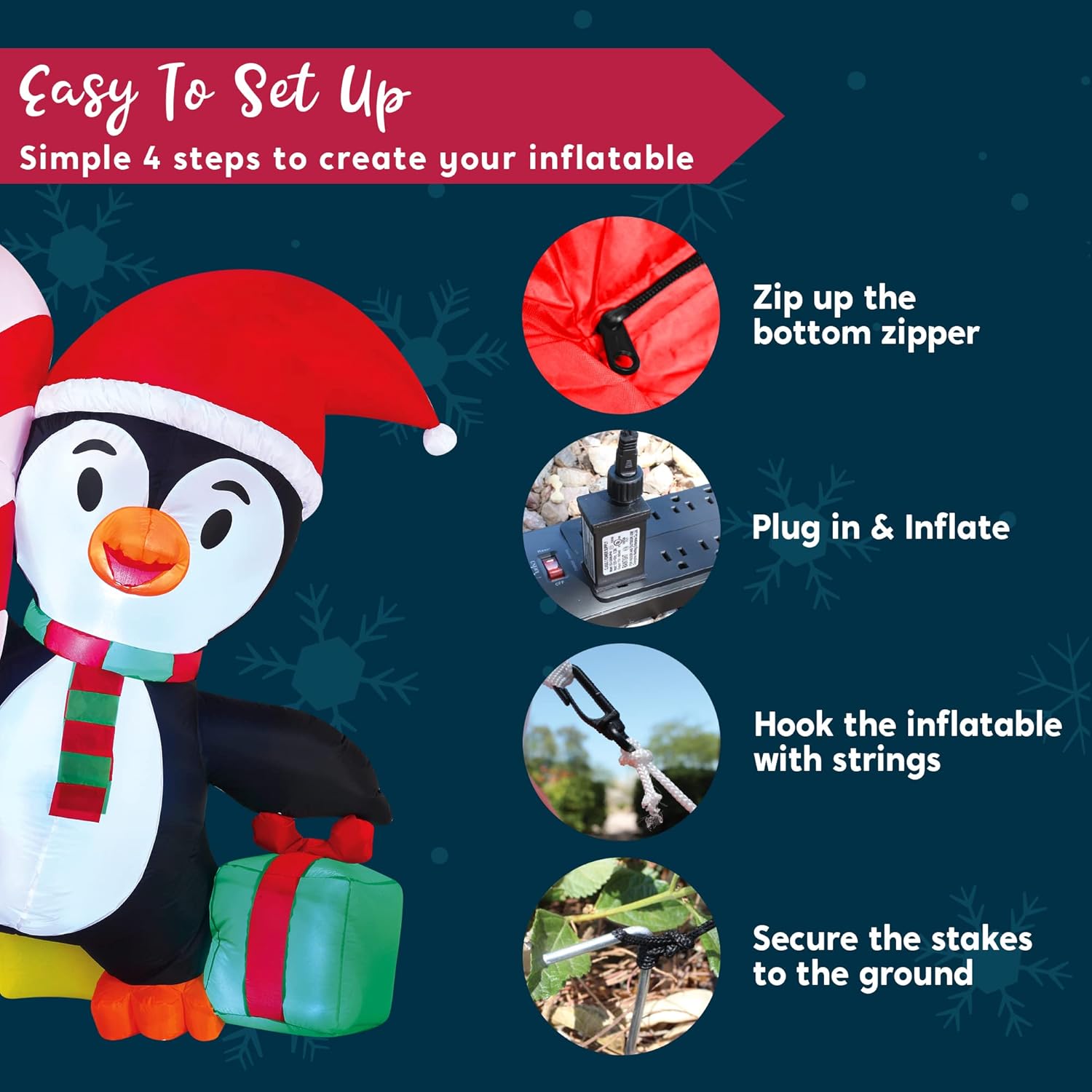 El inflable divertido de pingüino de invierno de 6 pies de altura viene con un cable extendido, clavos para el suelo, cuerdas aseguradas, bolsas de arena incorporadas y un enchufe con certificación UL.
