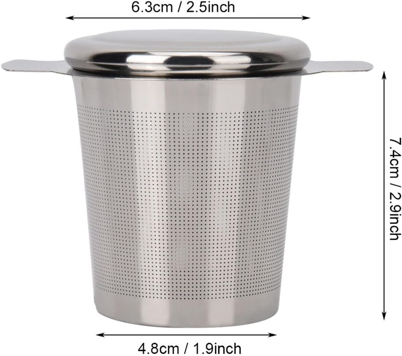 Specifications: Item: Strainer for Tea Drinking with Cover and Handle Material: 304 Stainless Steel Color: Silver Weight: Approx 46.5g/1.6oz Product size: Approx 7.4*4.8*6.3cm/2.9*1.9*2.5inch Package list: 1 * Stainless Steel Tea Strainer