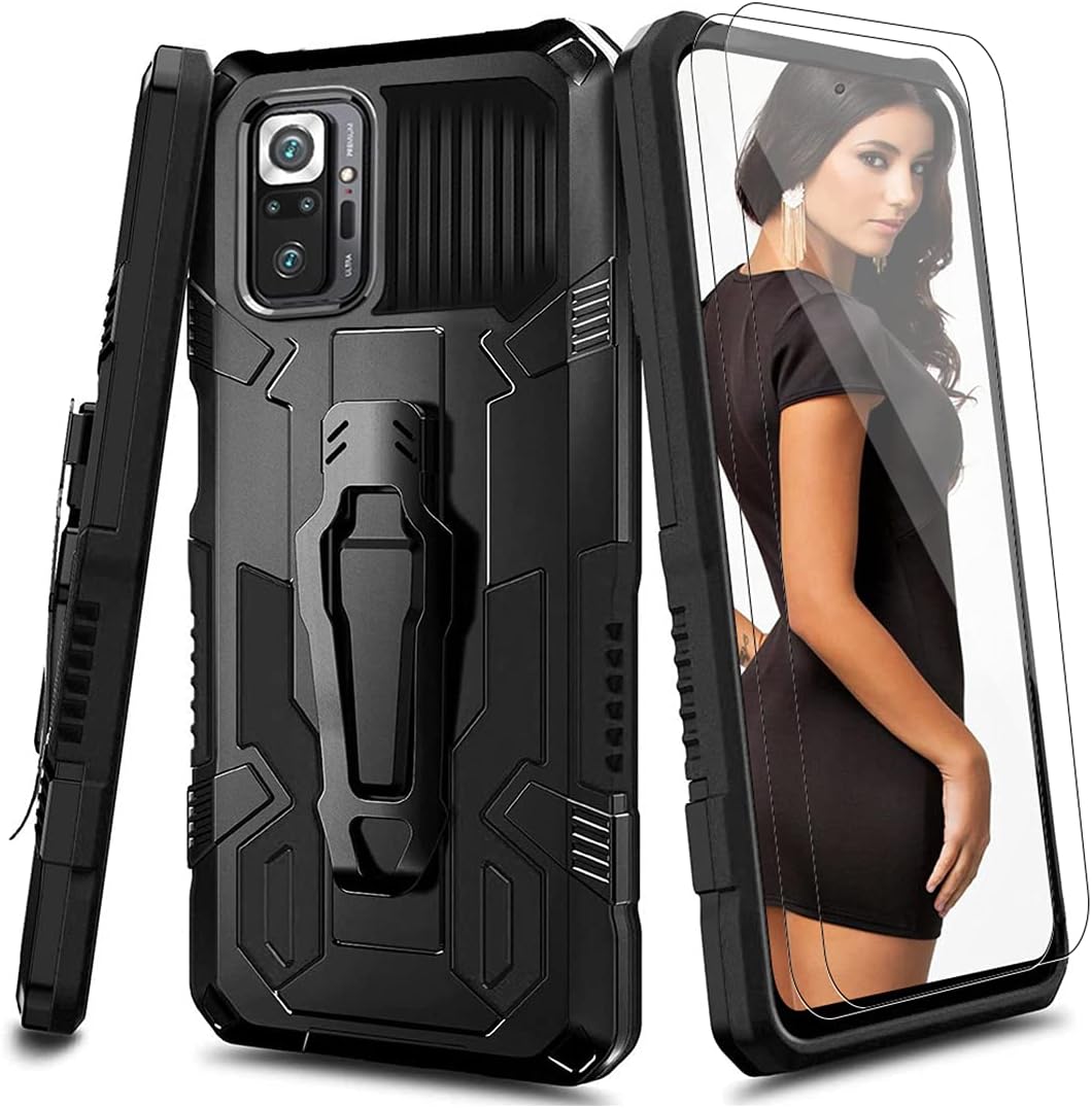 funda para Redmi Note 10 Pro con protector de pantalla de vidrio templado [paquete de 2] funda híbrida resistente de grado militar protección pesada de deber híbrido con clip de respaldo de metal para Redmi Note 10 Pro Max funda - negro
