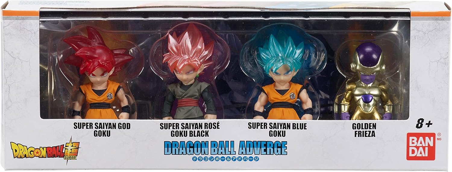 Dragon Ball Super Dragon Ball Adverge Figure Box Set - This box set contains four collectible 3" figures. Set 1 includes Super Saiyan God Goku, Super Saiyan Rose Goku Black, Super Saiyan Blue Goku, and Golden Frieza.