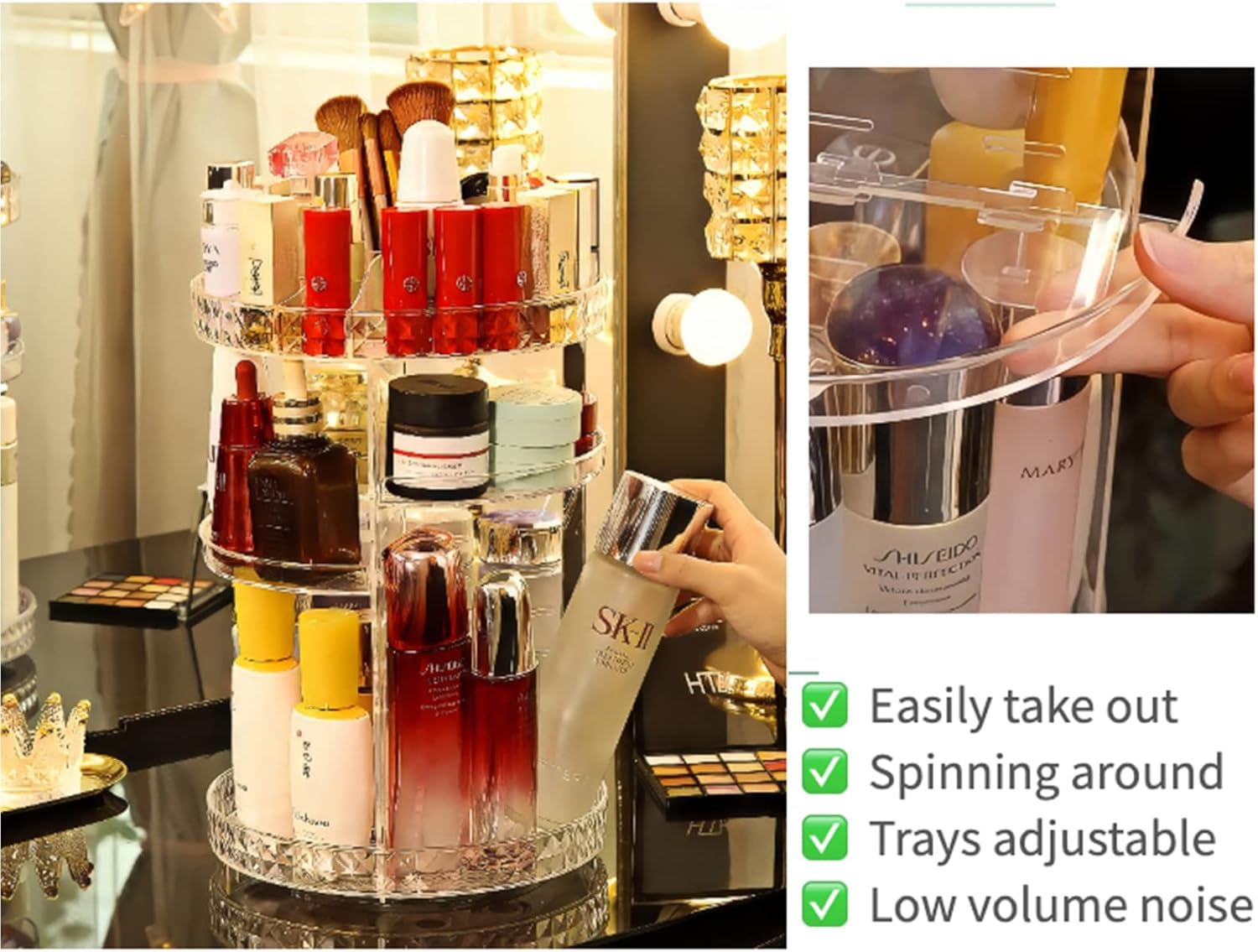 【EL ORGANIZADOR DE MAQUILLAJE MÁS ECONÓMICO】El organizador de maquillaje giratorio de 360 grados es una opción perfecta para organizar y almacenar tus productos cosméticos. Nuestro organizador de maquillaje se adapta a todos los tipos diferentes de cosméticos y accesorios ajustando la bandeja según la altura de tus productos. El diseño giratorio te permite obtener fácilmente los artículos desde todos los lados.