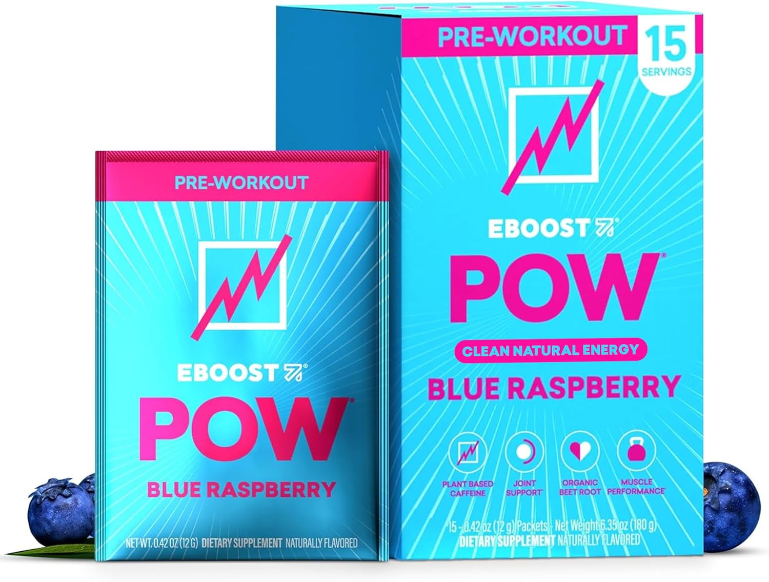 EBOOST POW Natural Pre Workout Powder - 15 Packets, Blue Raspberry - Preworkout Energy Booster Gym Supplement Drink Mix for Men and Women - Performance, Joint Mobility Support - Gluten-Free