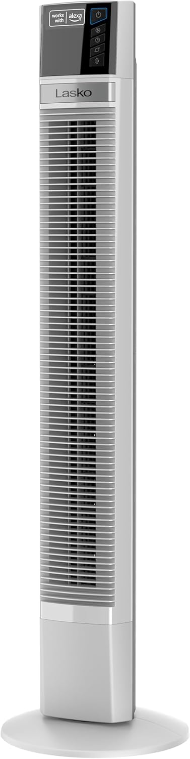 Lasko Works with Alexa Oscillating Tower Fan, Voice Controlled, 4 Quiet Speeds, Sleep Mode, Timer, Bedroom, Living Room, 48", White, T48401