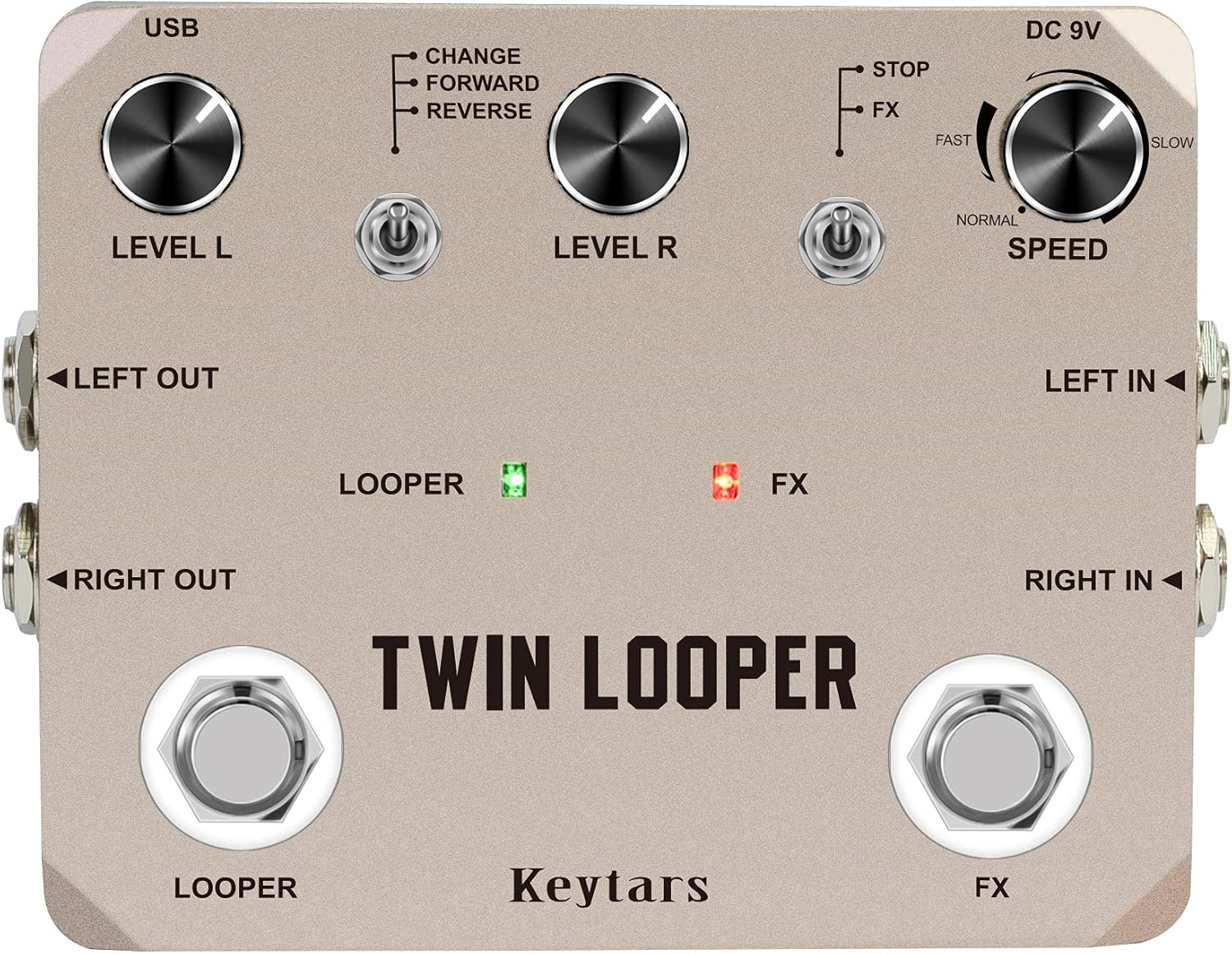 Keytars is a professional manufacture seller who sells guitar effect pedals, looper pedals and other instrument parts. Keytars is committed to developing high quality products and help every music lovers create their own tone. If you receive unsatisfactory products, please free feel contact us for solutions. Color:Golden Product Description ??Twin looper is the perfect blend of quality,creativity and simplicity, can mtach your instrument to make a subtle performance or a jaw dropping show. ??Looper Guitar Pedal allows you to play loops in reverse, you can reverse loops or slow them down to fast, halfspeed or both at the same time. ??11 types of play, stereo input and output, and left and right channels volume individually adjustable .HiFi sound/ no noise. ? ?10 minutes of looping time, unlimited overdubs and undo/redo function. ??Small size, heavyduty footswitch, true bypass, full metal sturdy and well built case. Specifications Input: Two 1/4 Jacks (Impedance: 470k Ohms) Output: Two 1/4 Jacks (Impedance: 100 Ohms) Sampling Rate: 44.1K Sampling Accuracy: 24bit 105 dB Dynamic Range Working current: 165 mA Power Supply: 9V AC adapter (positive Tip) Dimensions: 116mm (D)x90mm (W)x35mm (H) Weight: 522g (with box) Whole Aluminiumalloy classic, stable and strong. Note The power adapter is not included Precautions ·Environment: Do not use the pedal in high temperature, high humidity, or subzero environments. Do not use the pedal in the direct sunlight. ·Please do not dissemble the pedal by yourself. ·Please keep the manual for future reference. Package included 1 x Twin Looper Guitar Effect Pedal 1 x U