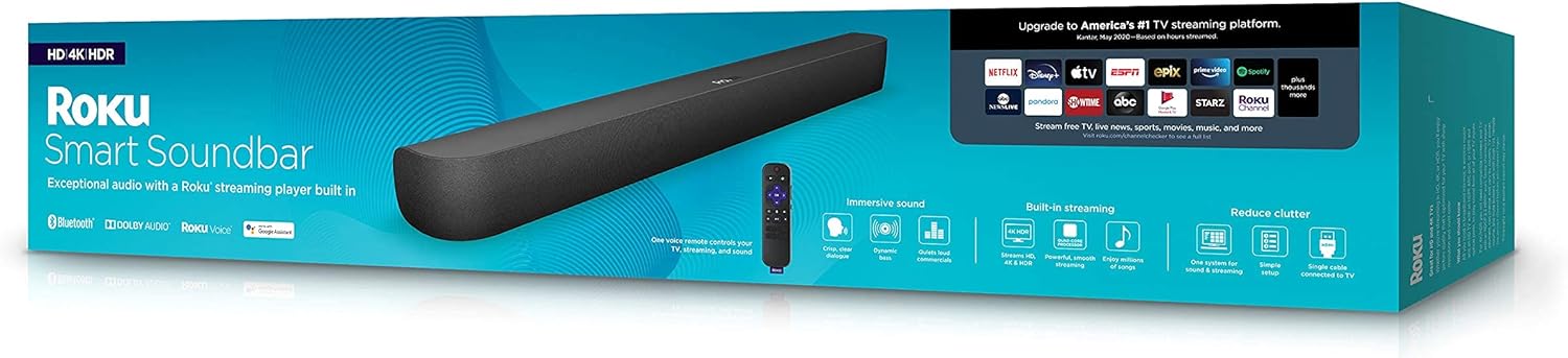 Roku Smart Soundbar, 4K/HD/HDR Streaming Media Player & Exceptional Audio Includes Roku Voice Remote (Renewed)