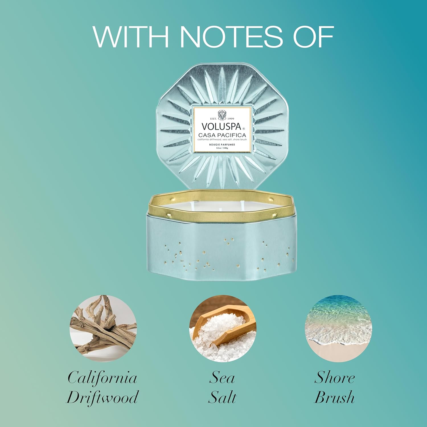 Voluspa Casa Pacifica, 3 Wick Tin Candle, 12 Ounces, 40 Hour Burn Time, Coconut Wax for Clean Burning, Handcrafted in The USA