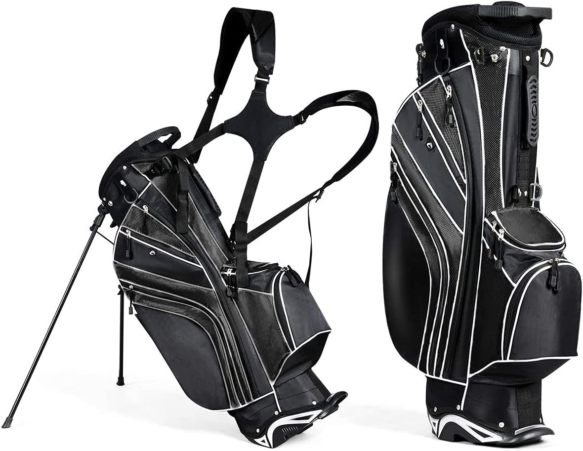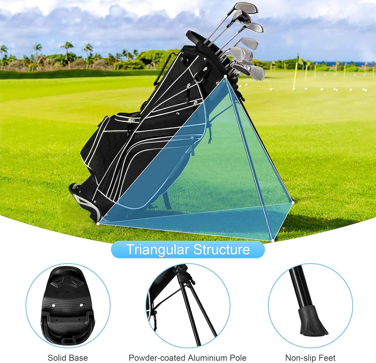 🎒【Extra Large Storage Space】: Featuring light weight of only 5lbs and portability, its 6 way dividers surprisingly offers you enough space to accommodate your golf clubs. There are 7 pockets on this golf stand bag to bring you additional storage space, which you can put various accessories in.