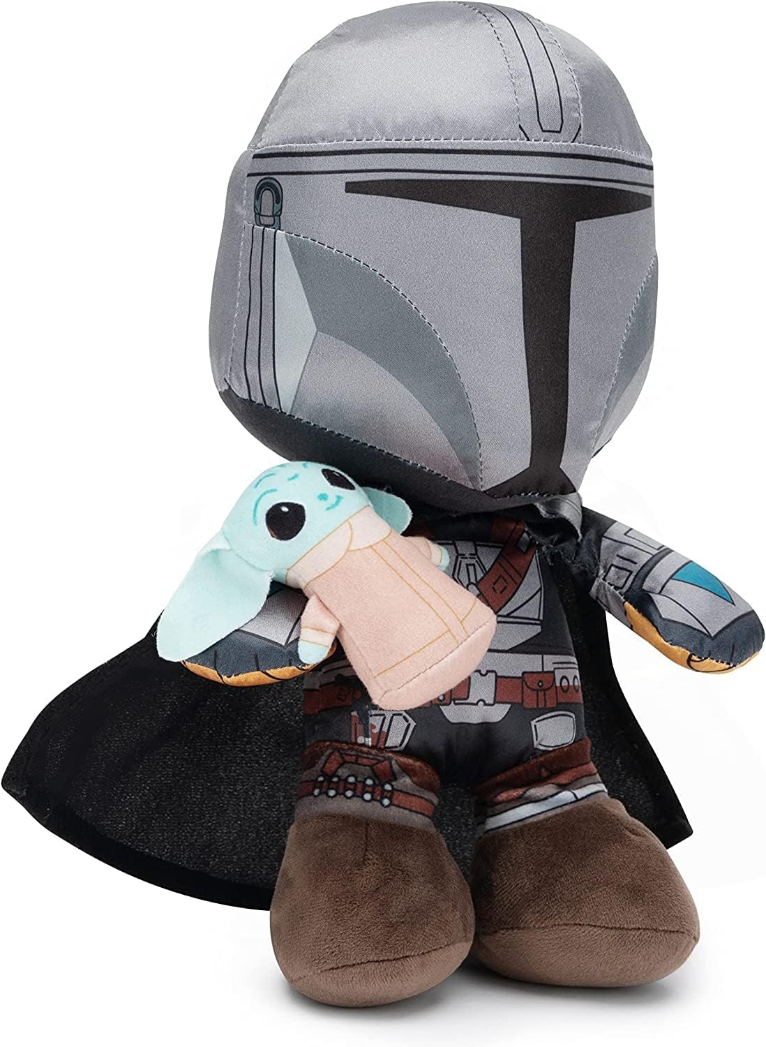 Deluxe Plush from Simba Toys The Mandalorian holding Grogu. Mando holds baby Yoda who is attachable by velcro. This plush uses the latest design and fabric and is a perfect collectable or plush gift for any fan